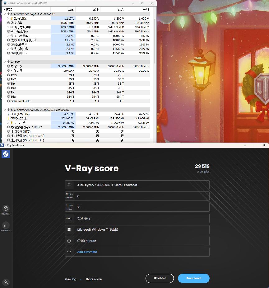 那继续给主板上点强度,V-ray,启动!在V-ray渲染器利用CPU降噪的基准测试下,CPU短时间爆发出了133W的峰值功耗,最后取得2.9万分成绩。