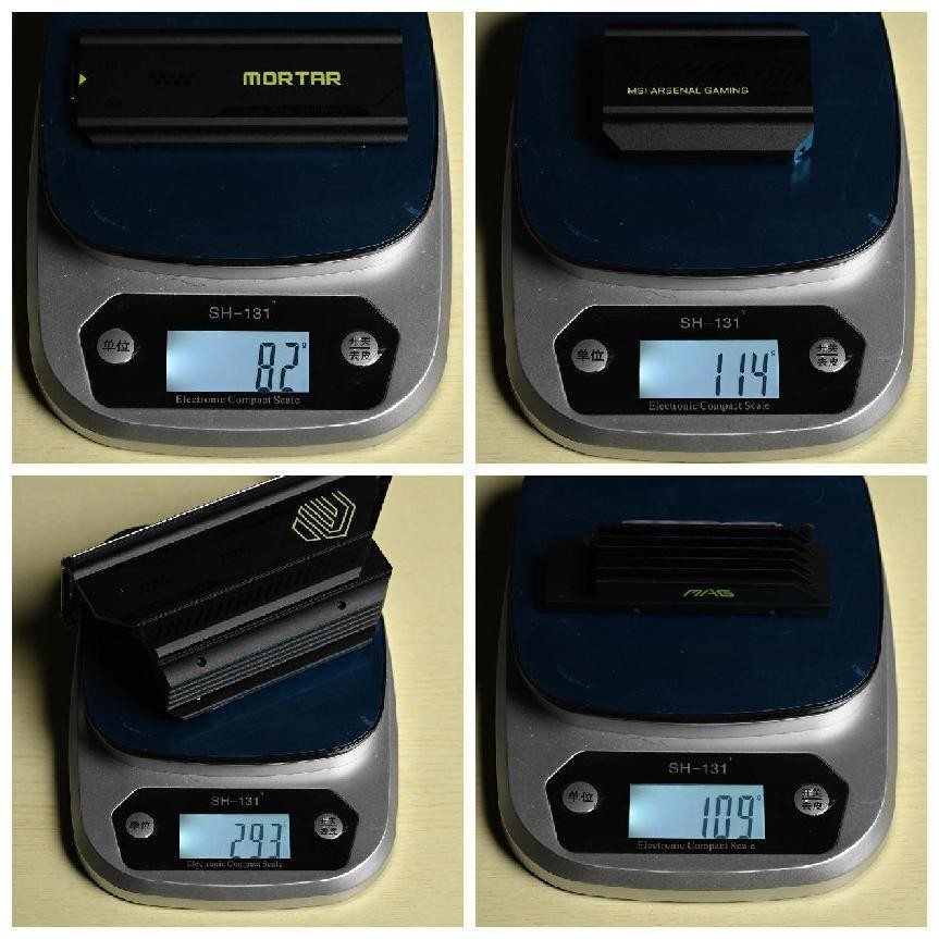 主板供电模组装甲_1/_2、主板固态硬盘散热装甲、PCH芯片散热装甲的重量分别为293g、109g、82g和114g。