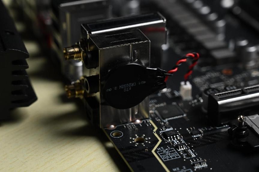 主板BIOS供电的纽扣电池采用了“尿袋”方式挂载在WI-FI 6天线基座上,由于无需电池基座,所以主板可以布置更多的线路和元件。