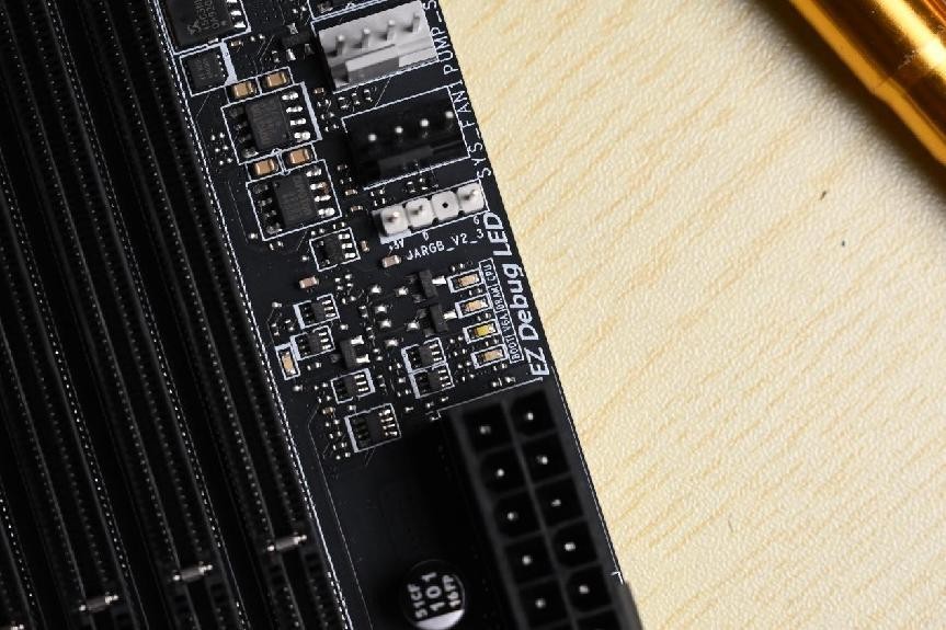 内存旁边搭载了EZ Debug灯,开机时依次检测CPU-内存-显卡-引导,是一个合格主板的必备功能。当某一项设备开机检测无法通过时,灯就会卡在对应位置发出红光提示玩家检查。