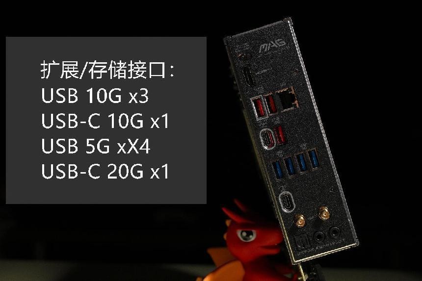 微星MAG B850M MORTAR WIFI迫击炮IO挡板和主板本身是一体化的,上面集中了较为复杂的功能按键和丰富的接口,从上往下的开口分别为: