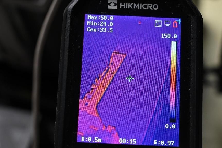 测试时环境稳定恒定19度,通过海康威视H11手持热成像仪观察散热片表面的温度状态,观察发现,在CPU满载运行时,散热片中心温度超过了30度,而热点温度来到了50度左右,可以说明迫击炮散热片是实实在在的发挥了作用。