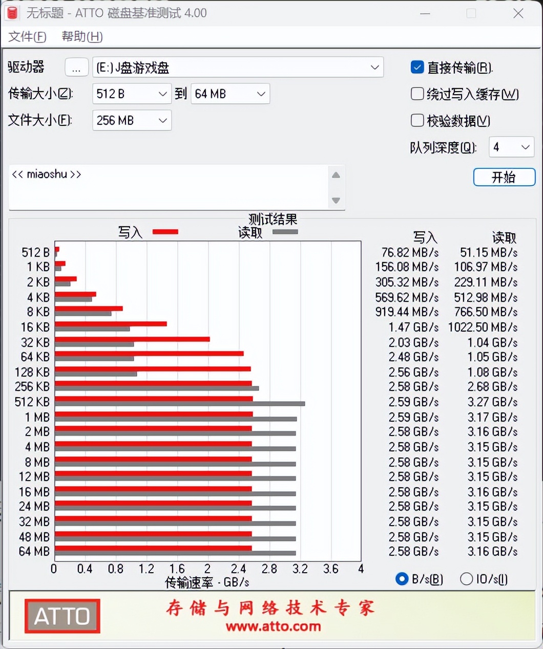 磁盘基准测试中,由于我只有PCIe 4.0固态,所以测试的磁盘速度取决于SSD的上限,无法达到主板PCIe5.0满速水平。在ATTO基准测试中,4kb小文件读写速度超过了500MB/s,而在512kb文件后的传输速度就稳定在了读取:3.1GB/s,写入2.58GB/s。
