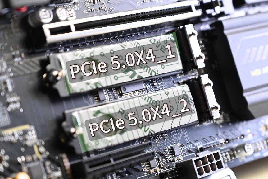 固态散热片采用Easy Set设计,单手即可进行安装,散热片下是两个M.2插槽,均支持PCIe 5.0 X4,底部有散热垫辅助降温,使用前请将黑色纹理的保护贴纸撕下来。