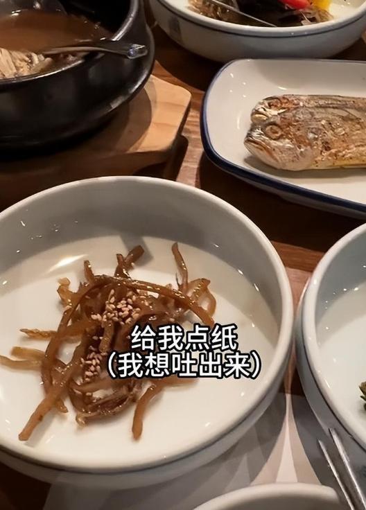 随后她来到一家装修考究的餐厅品尝韩式国宴。餐具摆放考究,餐桌布置精致。服务员陆续端上31道菜品,每道菜分量都极其小巧。这些菜品主要由各式泡菜、咸菜、腌萝卜构成,仅有一小份咸鱼作为荤菜。这份咸鱼处理不够干净,还带着浓重的腥味。