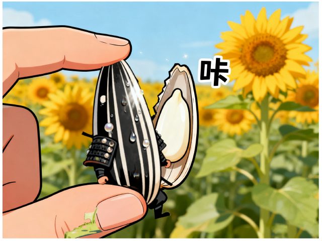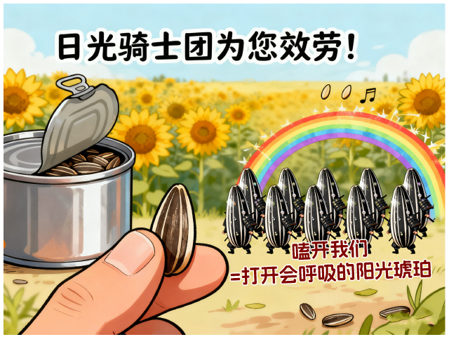 瓜子军团立即列队致敬:“日光骑士团为您效劳!”,拇指与食指轻捏的刹那,战甲应声绽开彩虹桥,仁肉在齿间跳起芭蕾,连空气都变得轻盈通透「嗑开我们=打开会呼吸的阳光琥珀」。
