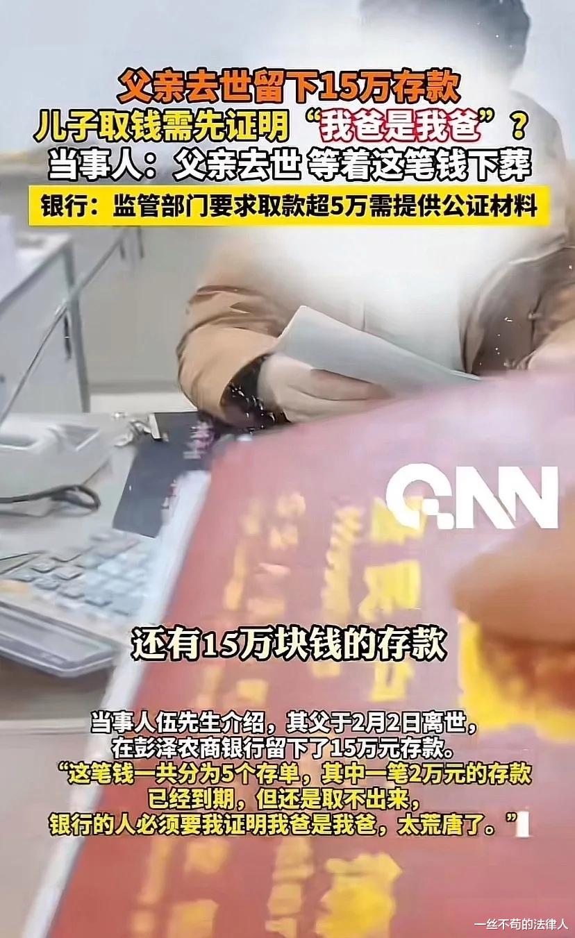 江西九江彭泽县的伍先生近日遭遇了继承困境。他的父亲去世后,留下了15万元银行存款。父亲后事急需用钱,遗体还停放在殡仪馆,但当伍先生带着身份证、户口本及父亲的火化证前往银行时,取款请求却被拒绝。