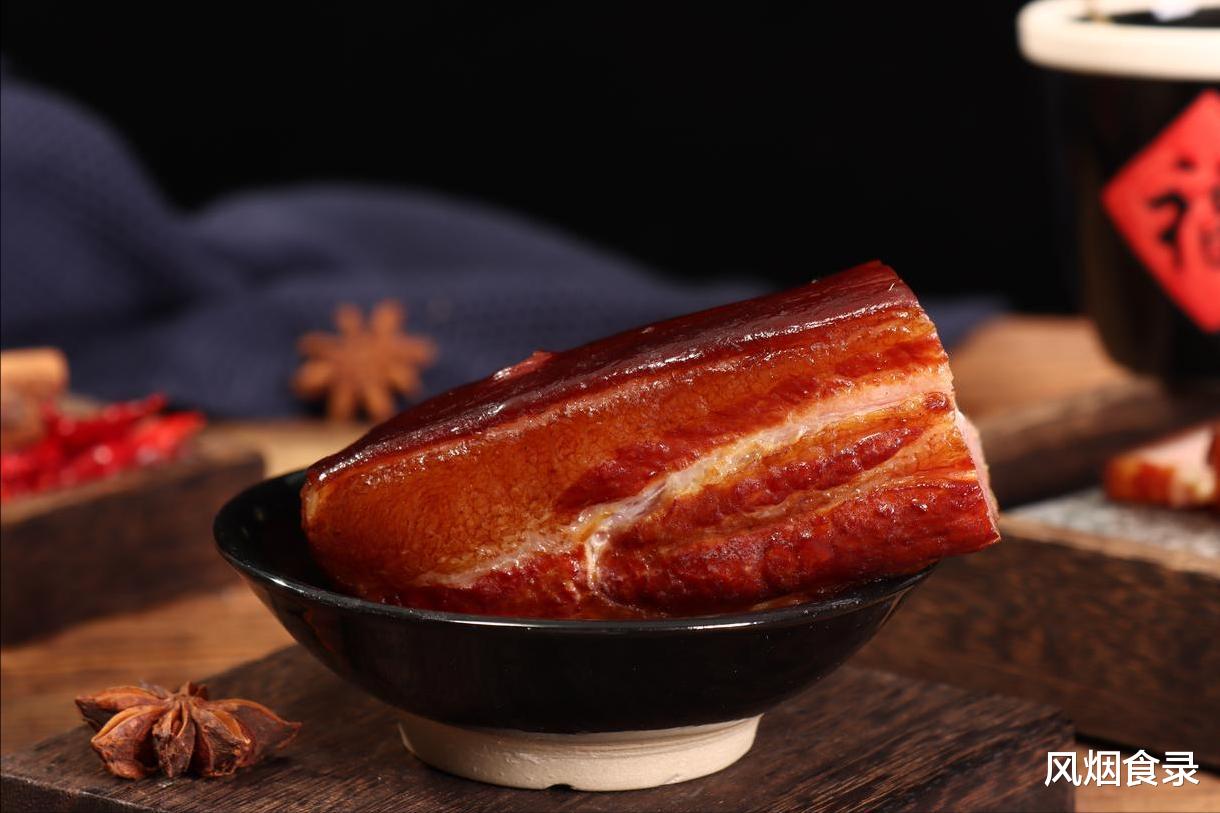 冬月杀黑猪,冷腌时撒花椒、八角、桂皮,十日后挂灶头,柏枝香椿慢熏三月,皮色金黄如琥珀,瘦肉枣红似玛瑙,
