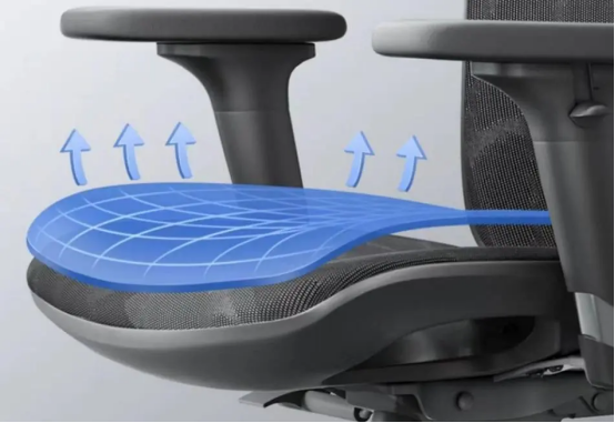 这款人体工学椅整体的尺寸会偏大一点,坐垫也比较宽,对体型较大的人群来说,还是很友好的。动态海浪式椅背能够贴合人体自然曲线,根据坐姿变化动态调整椅背贴合身体,三段式椅背结构可分别作用于肩部、背部和骶骨,提供更精细、动态的承托体验。腰靠4档角度可调,能满足不同腰部支撑需求,肩靠能动态跟随手臂活动,同步支撑肩部,让身体在久坐时能保持舒适。坐垫采用高弹网布材质,回弹力在线,支撑均匀,同时具备良好的透气性,即使长时间久坐,也不容易闷热,能有效保持坐感清爽舒适。