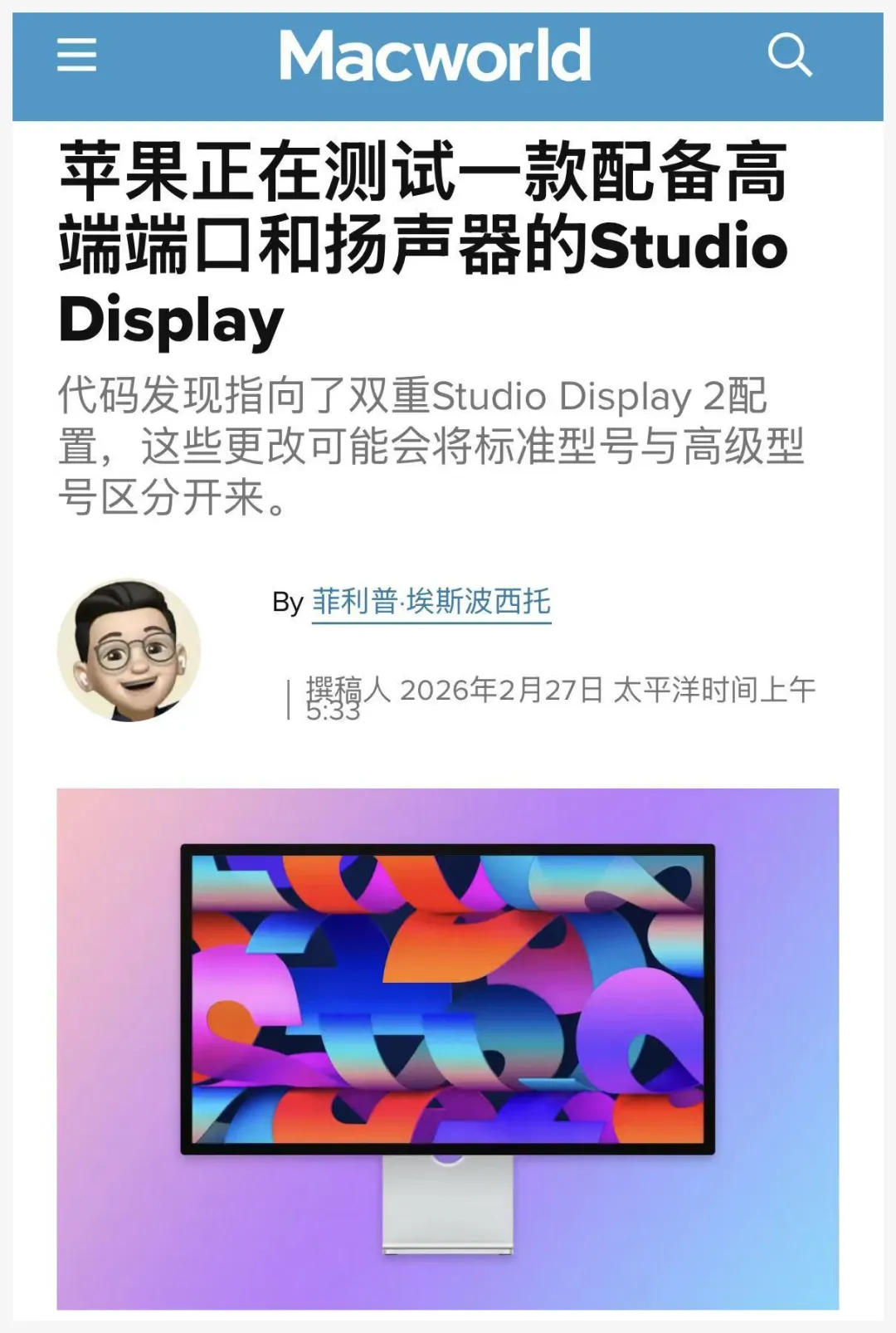 意味着Studio Display 2高端版将拥有更好的扬声器和更先进的接口,而且可能采用更大的显示面板,或达到32英寸;而标准版则依然保持在27英寸。