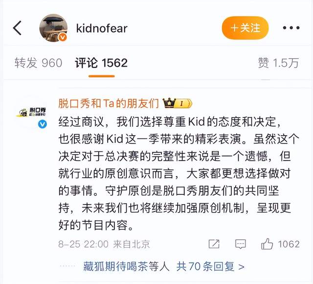 Kid宣称退赛后,节目组也迅速响应,表示尊重Kid的选择和决定,并且将继续秉承原创精神鼓励参赛选手们推出好的作品,向脱口秀迷们回馈更优质的内容。