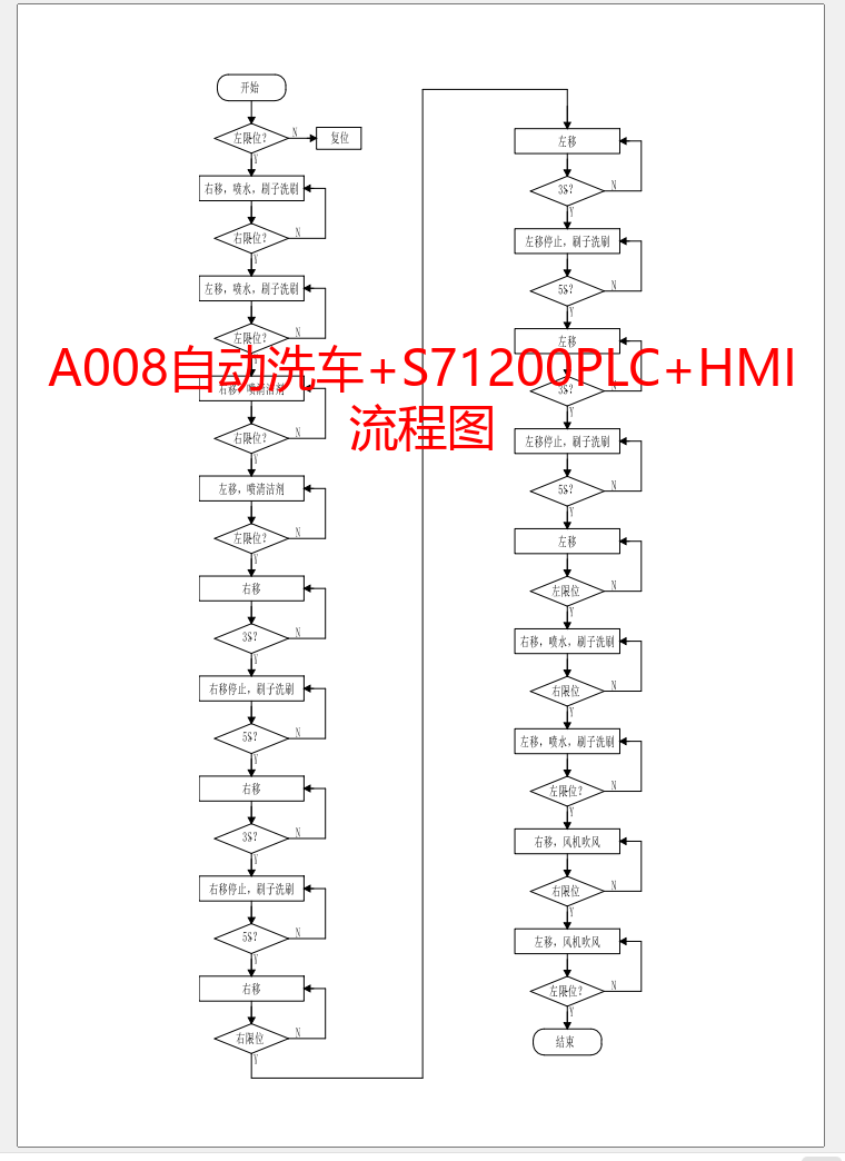 自动模式按以下流程运行:启动→右移+喷水+刷子刷洗→右限位触发→左移+喷水+刷子刷洗→左限位触发→右移+喷清洁剂→右限位触发→左移+喷清洁剂→左限位触发→分段刷洗→清水冲洗→风干→左限位触发→流程结束。
