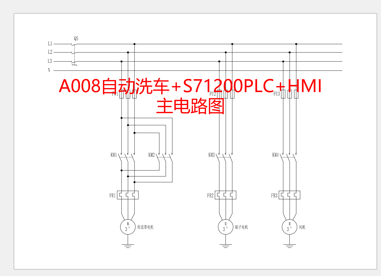 主电路采用三相交流电源供电,电源进线端设置总开关(QS)和熔断器(FU1),实现短路保护;传送带电机、刷子电机、风机分别通过接触器(KM1-KM4)控制电源通断,各电机回路串联热继电器(FR1-FR3),实现过载保护;电机采用星形或三角形接法,适配电源电压需求。