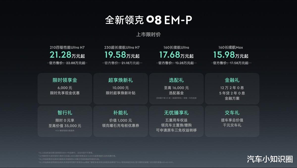 【2025年9月24日 上海】今日,“家庭豪华智混SUV”全新领克08 EM-P正式上市。新车提供160长续航Max、160长续航Ultra、230超长续航Ultra H7、210四驱性能Ultra H7四款车型可选,官方限时价15.98万元-21.28万元。同时,伴随新车上市还有限时领享金、超享焕新礼、选配礼、金融礼、智行礼、补能礼、无忧臻享礼、交车礼在内的8重限时福利。