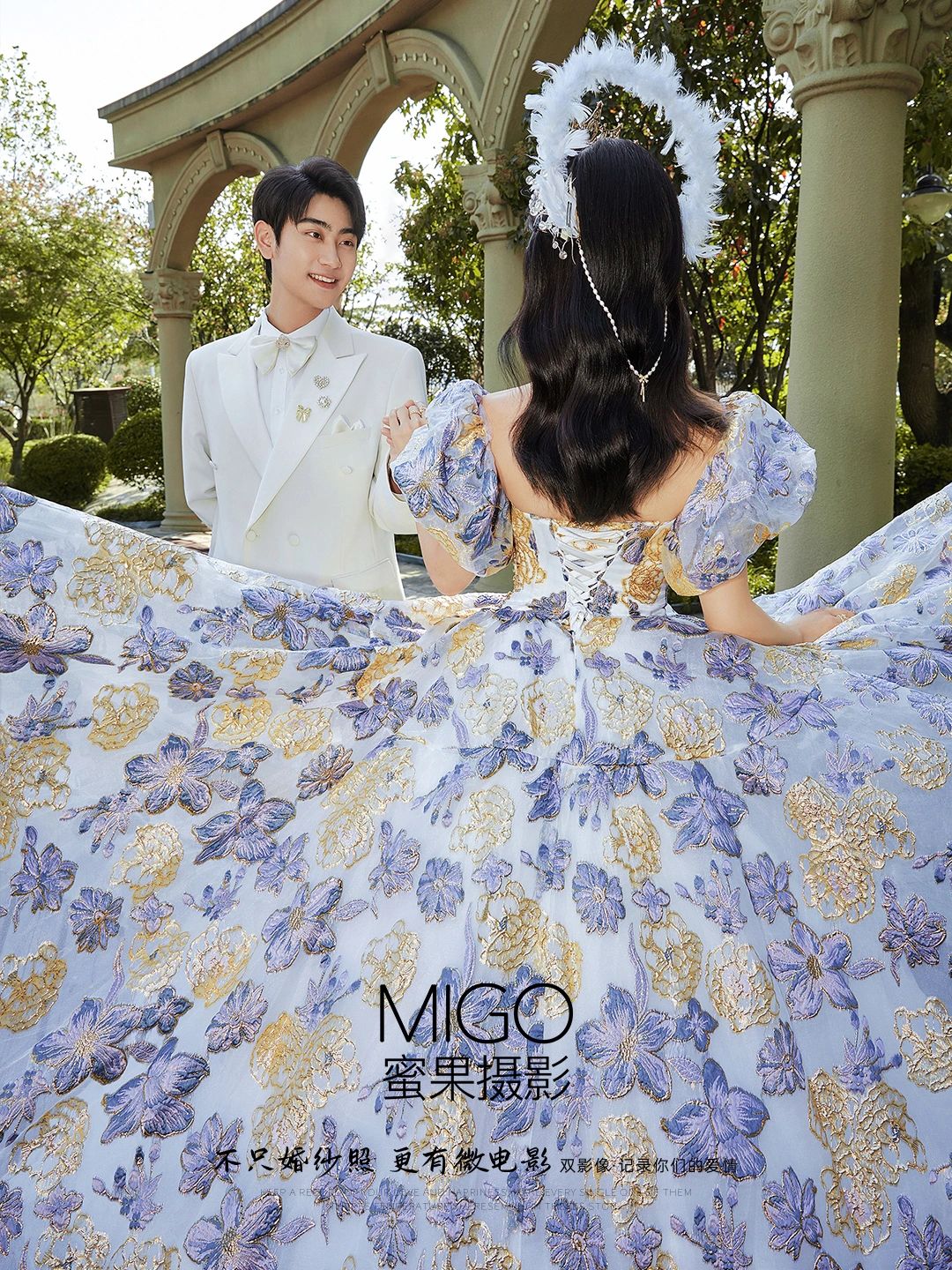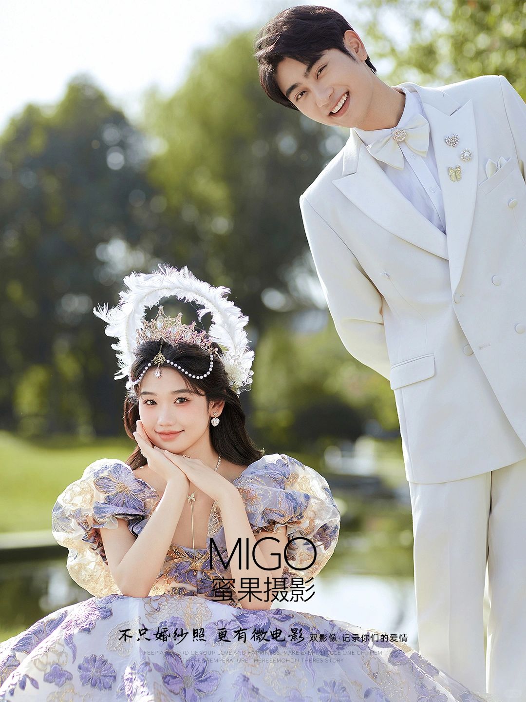 ✅精致的少女感羽毛头饰轻灵美好,宛若坠入人间的可爱仙女 ✅泡泡袖大裙摆婚纱加上精致的紫色绣花,浪漫别致超级减龄 ✅男士整套白色衣服王子般的绅士风度