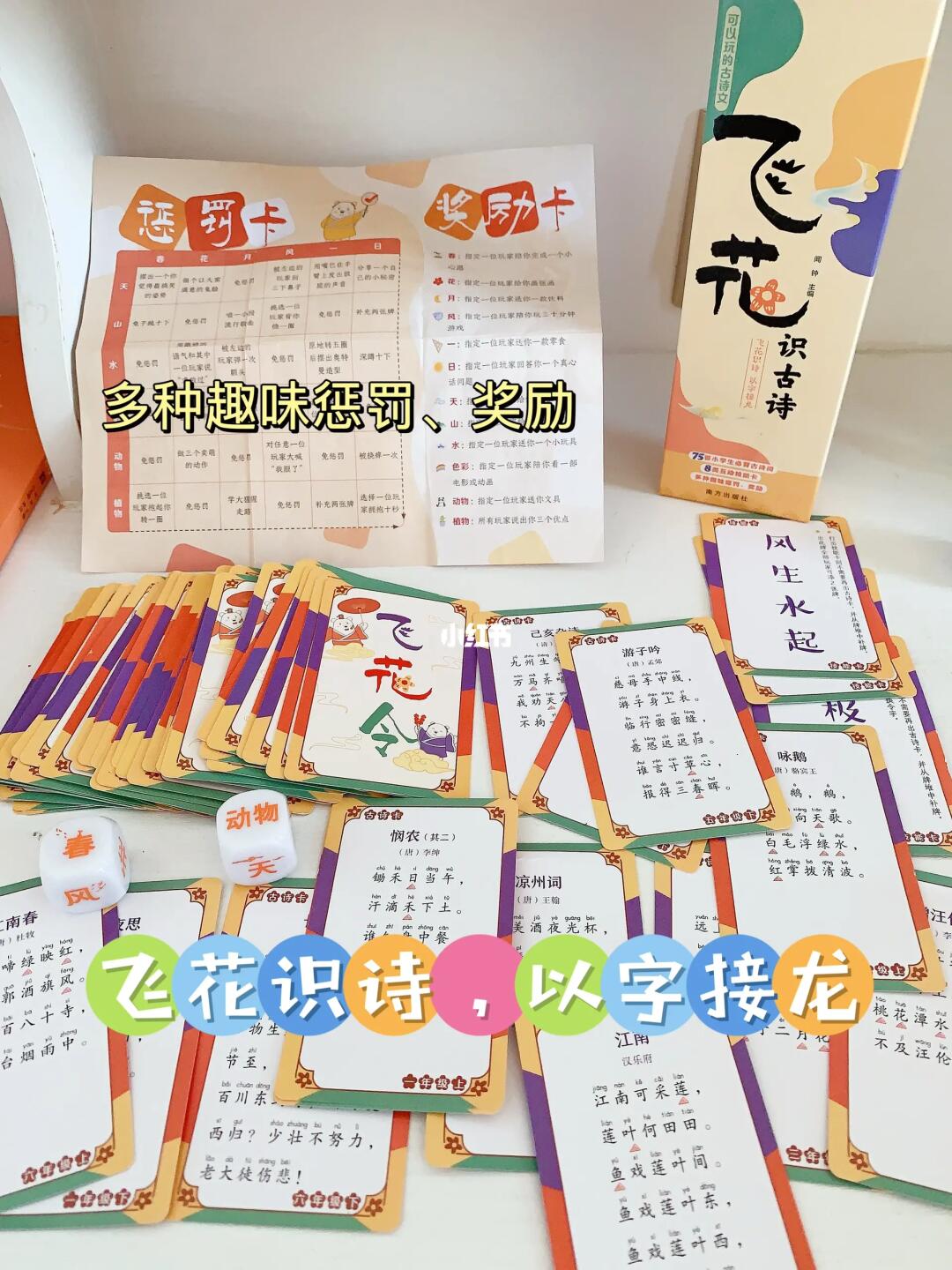 每张卡牌都是一首1-6年级必背的古诗词,并且全部带拼音!玩法非常简单,支持2-5个人,每个人筛骰子,筛到什么字,大家就要轮流打出包含这个字的卡牌,打一张再抽一张。