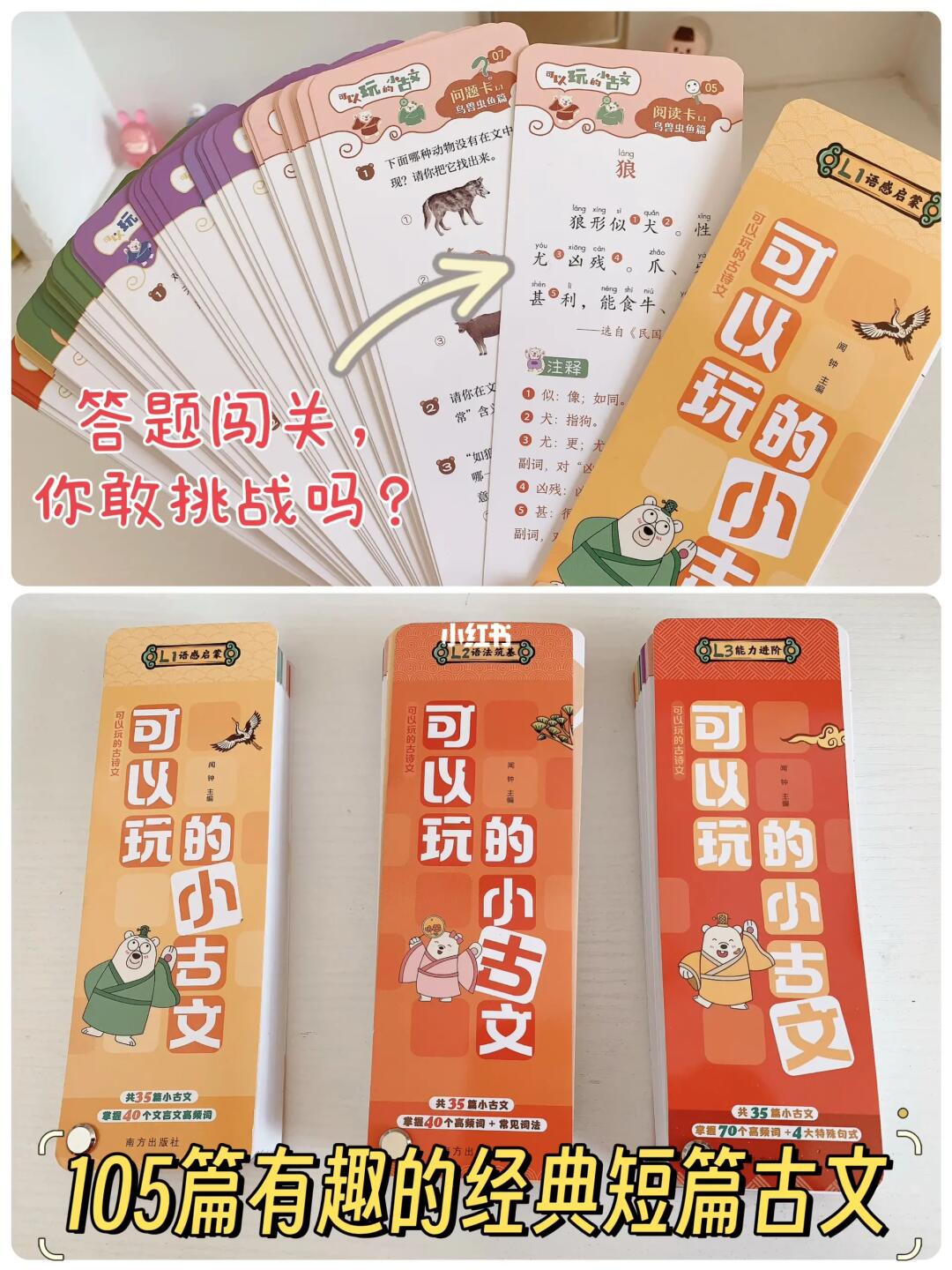 每一篇小古文的阅读卡,对应一张问题卡,阅读卡帮助孩子熟悉文言文的高频词培养语感,问题卡可以了解文言文解题思路和技巧。