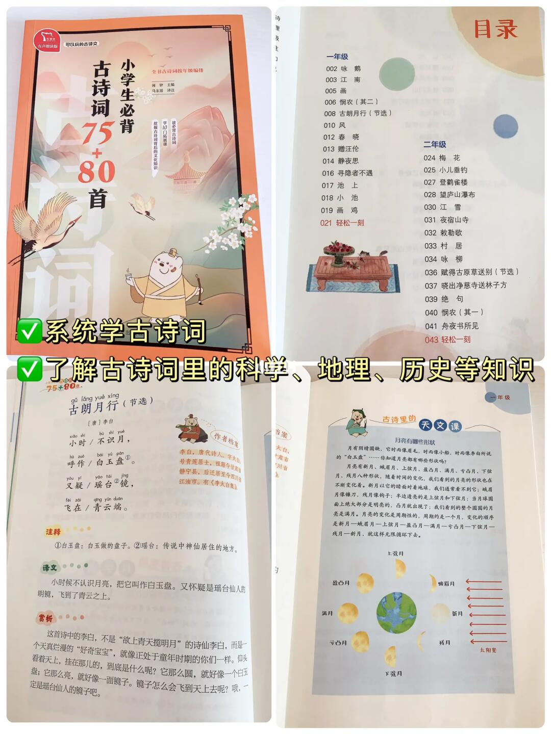 ✅1本《小学生必背古诗词75+80首》按小学年级编排,每首诗有作者介绍、注释、译文,拓展知识,家长教起来容易,孩子学起来也好理解。
