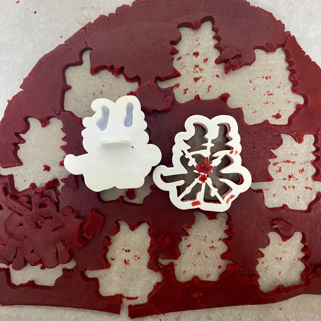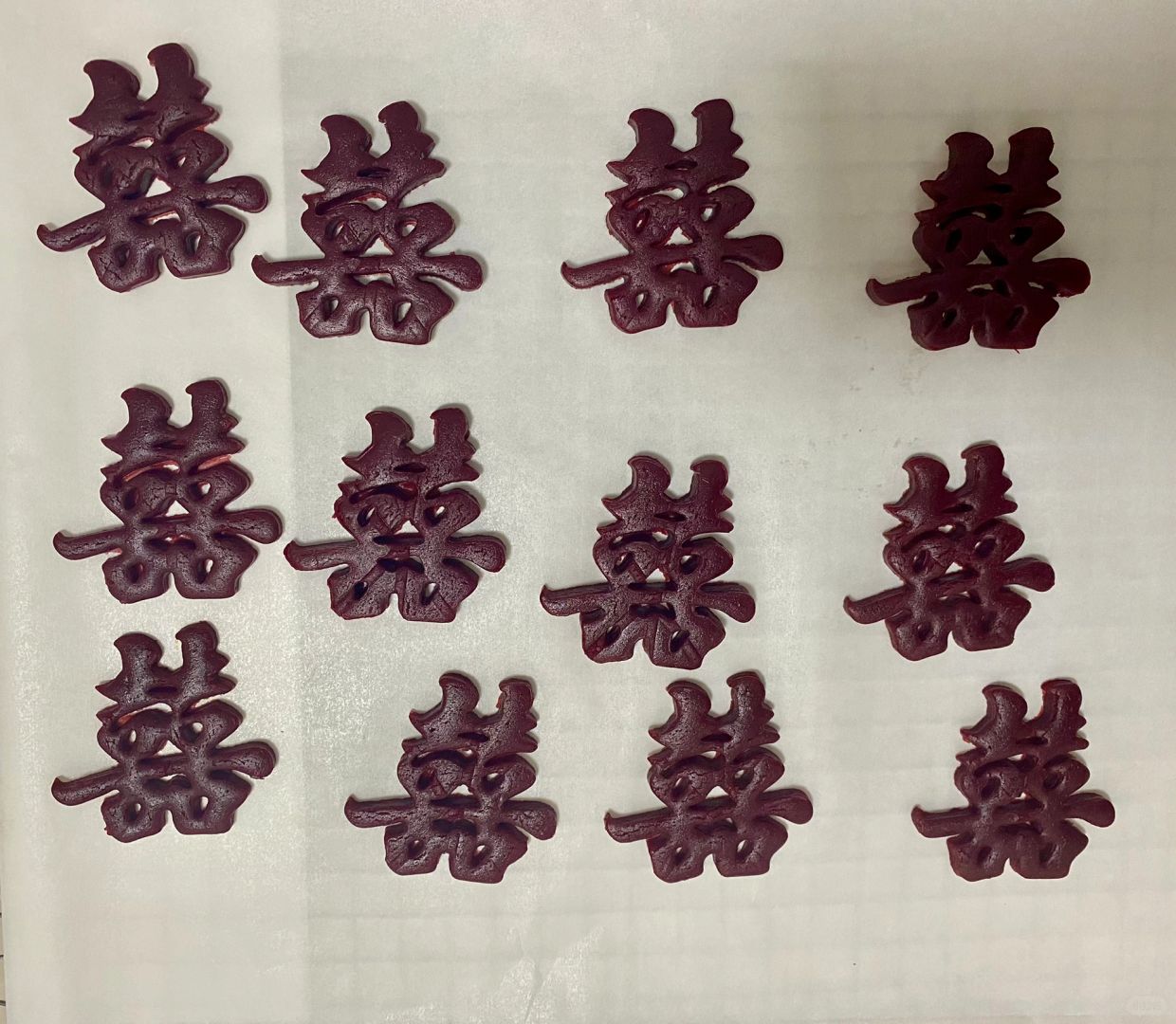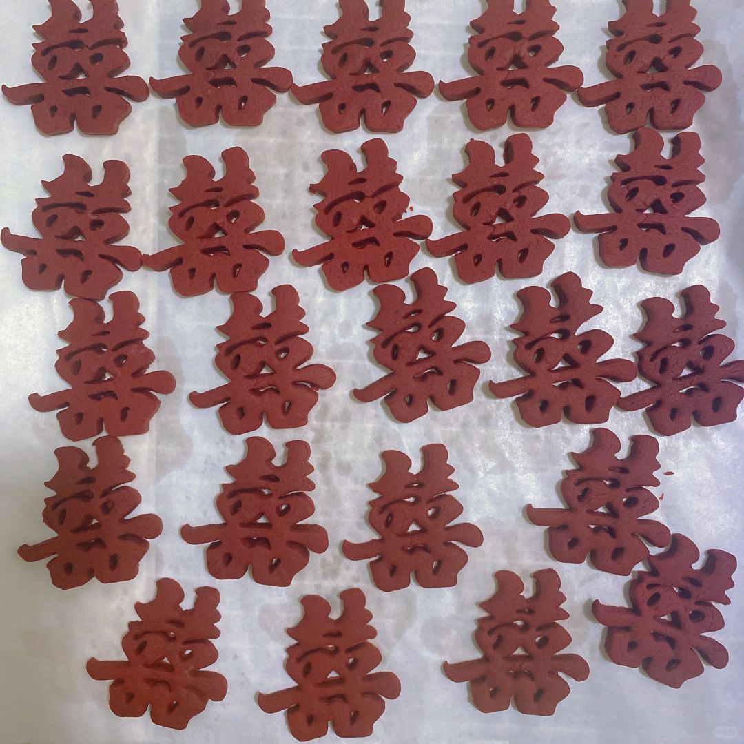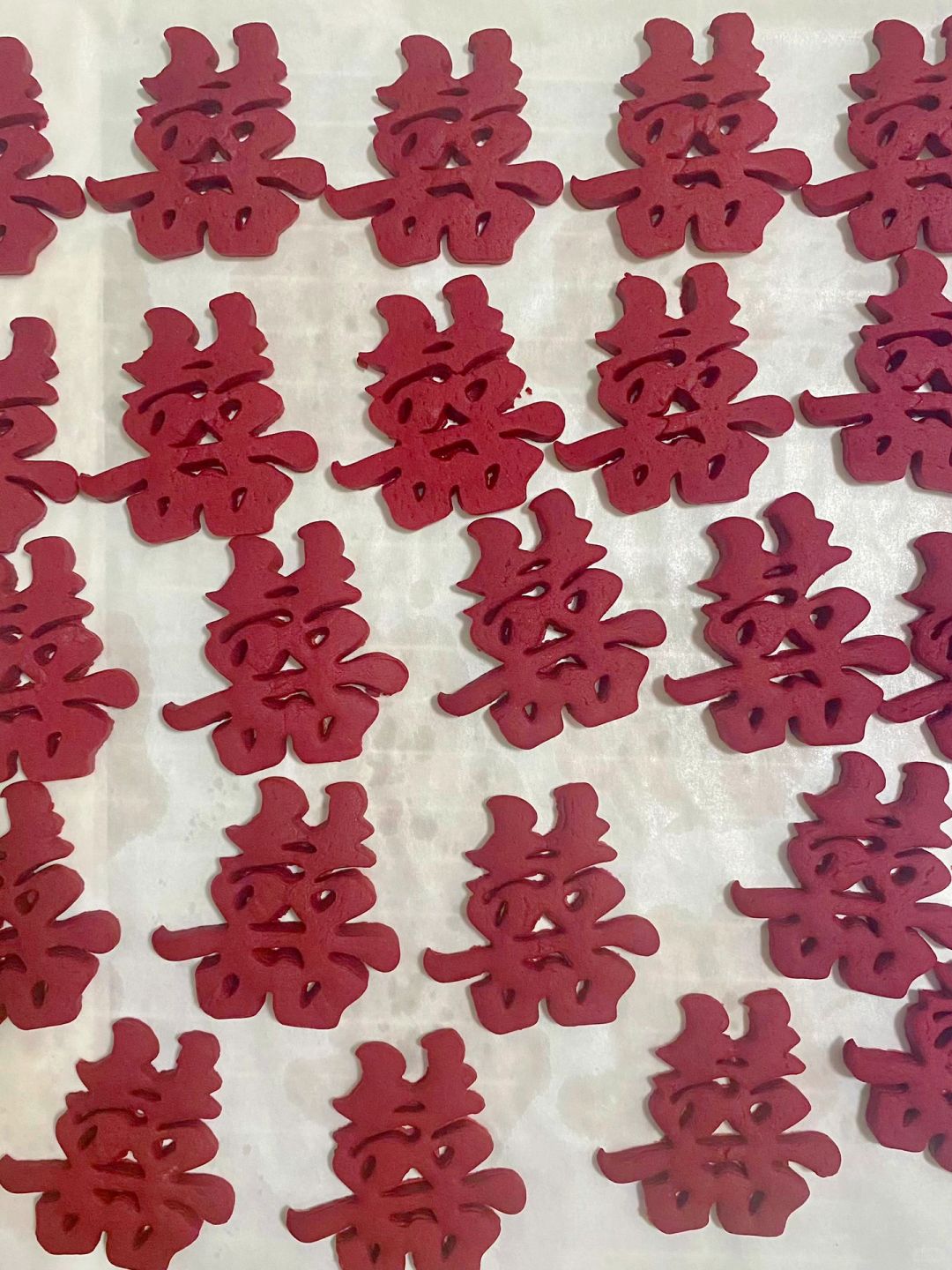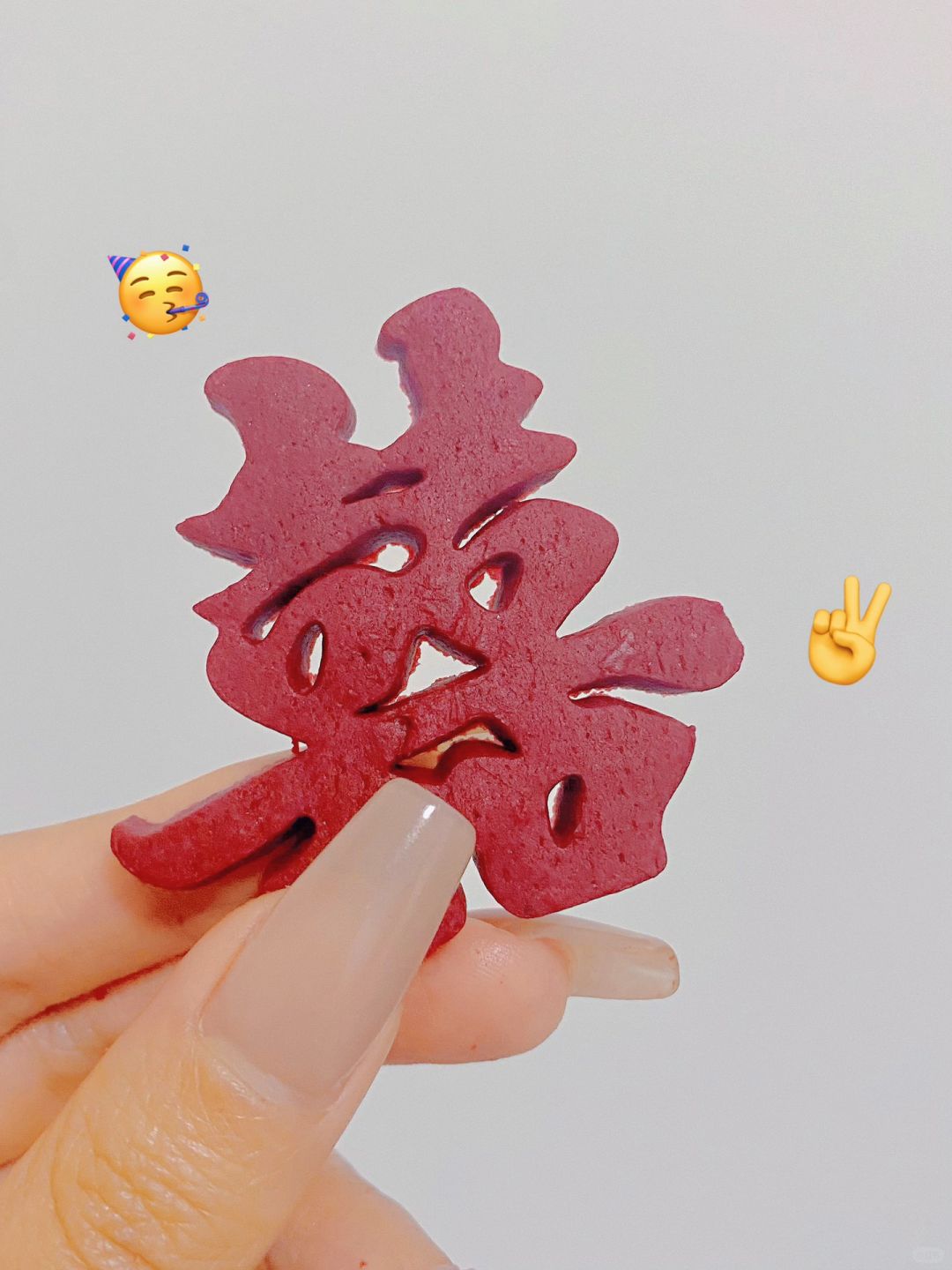 👩🍳 黄油🧈软化好加入糖粉打发至蓬松发白 鸡蛋液分次加入打发均匀 过筛低粉和红曲粉翻拌均匀,加入适量的红色色素❤️ 放在油纸上铺平擀至3mm的厚度放进冰箱冷冻半小时 模具印出喜字摆放整齐送入烤箱 上火140度下火150度烤18分钟🔥 最后5分钟可以盖上锡纸烤防止颜色烤太深了