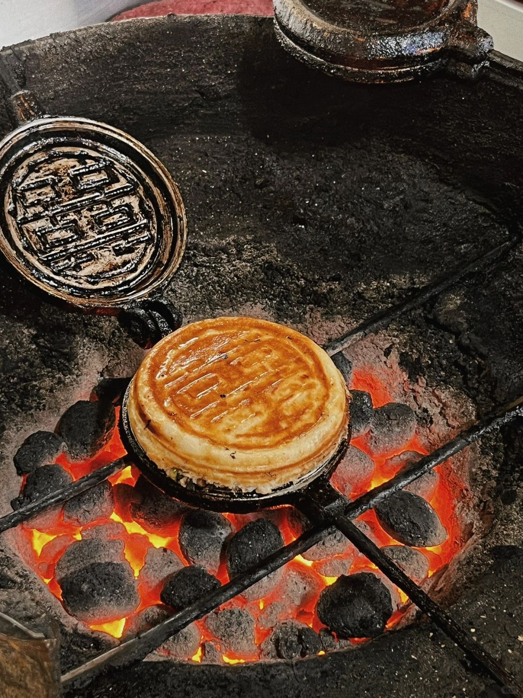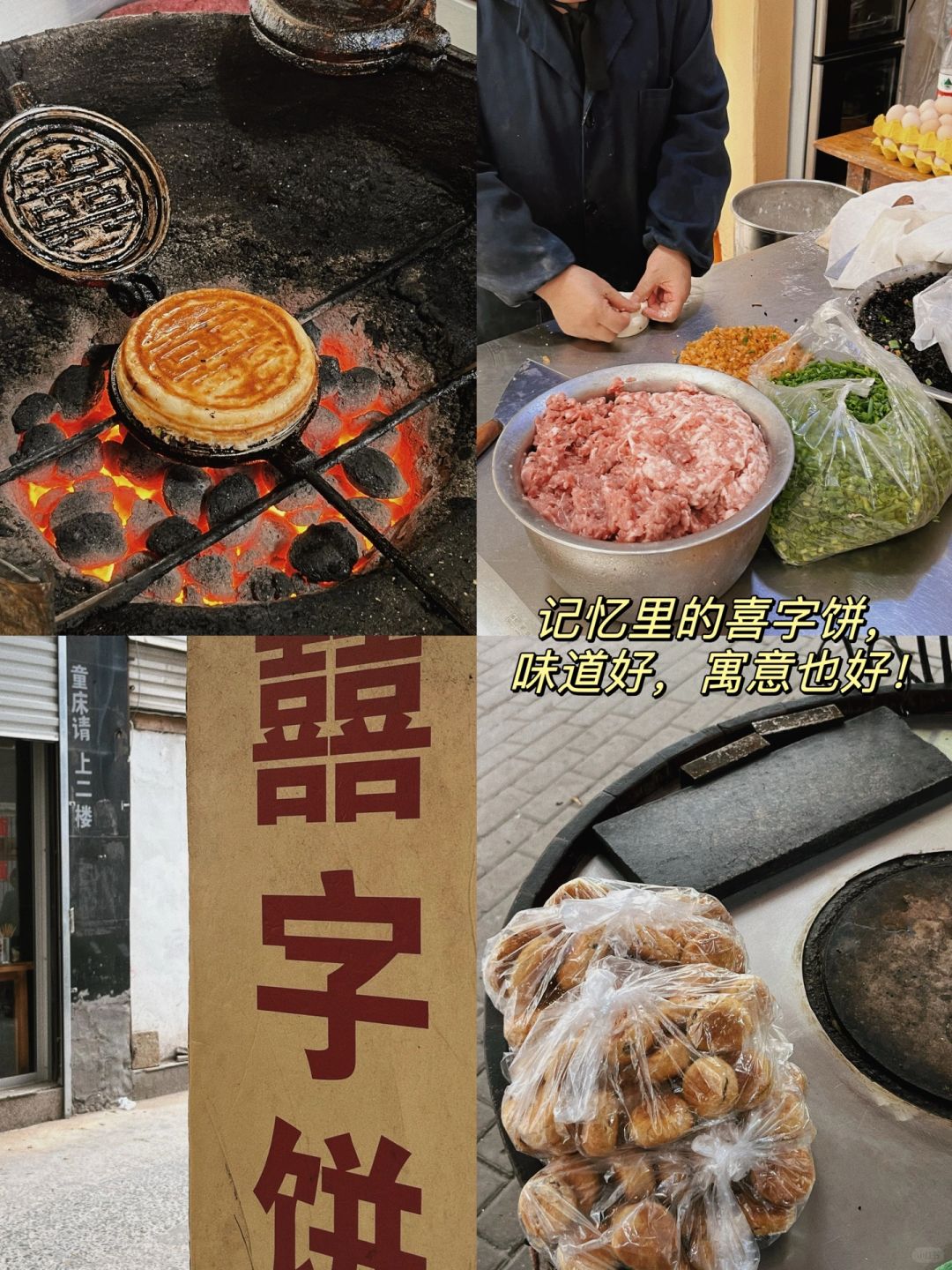 第2⃣️站:传统小吃喜字饼。价格💰10到19/个 这个宝子们直接导航搜就可以啦。喜字饼小摊现在逐渐销声匿迹了,只有泽国的这家开成了店,保留下来了。喜字饼造型就很讨人喜欢,一大个鼓鼓囊囊的,正反面都有烙上的喜字。我们买的是基础版,十块钱一个,内馅有梅干菜,五花肉,榨菜和小香葱,很丰富,喷香个!
