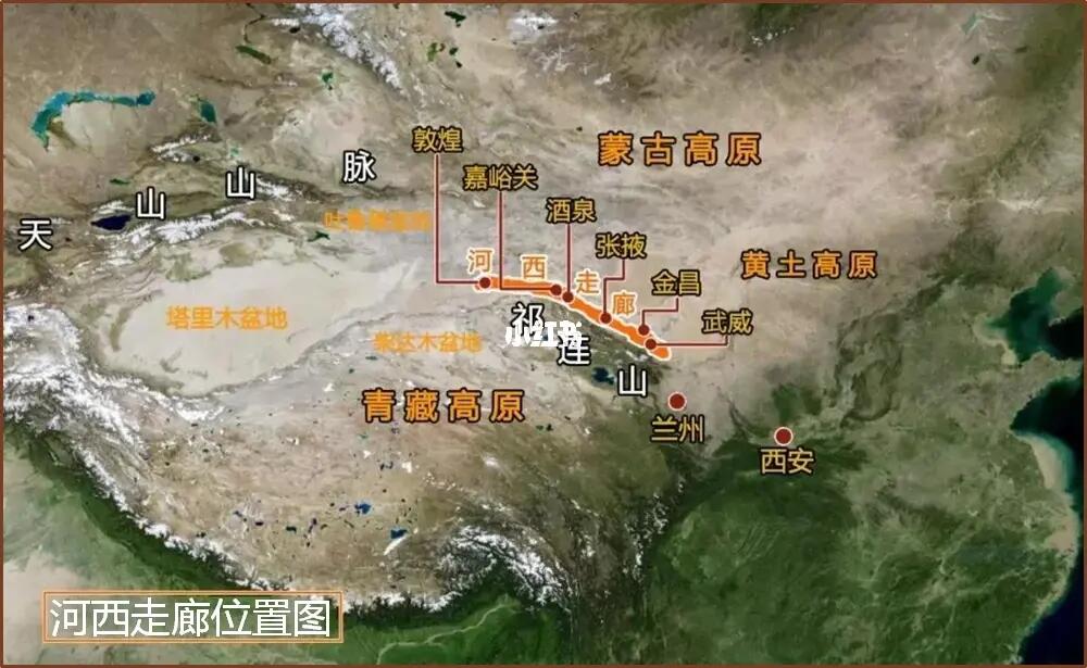 📻河西走廊东起兰州以西的乌鞘岭下,西至罗布泊洼地边缘,南靠连绵起伏的祁连山脉,北挨荒凉山地(北山)与沙漠。东西长度约1000公里。在这狭长的地方,有卫星发射基地、鸣沙山、月牙泉、敦煌、莫高窟、嘉峪关等著名景区。
