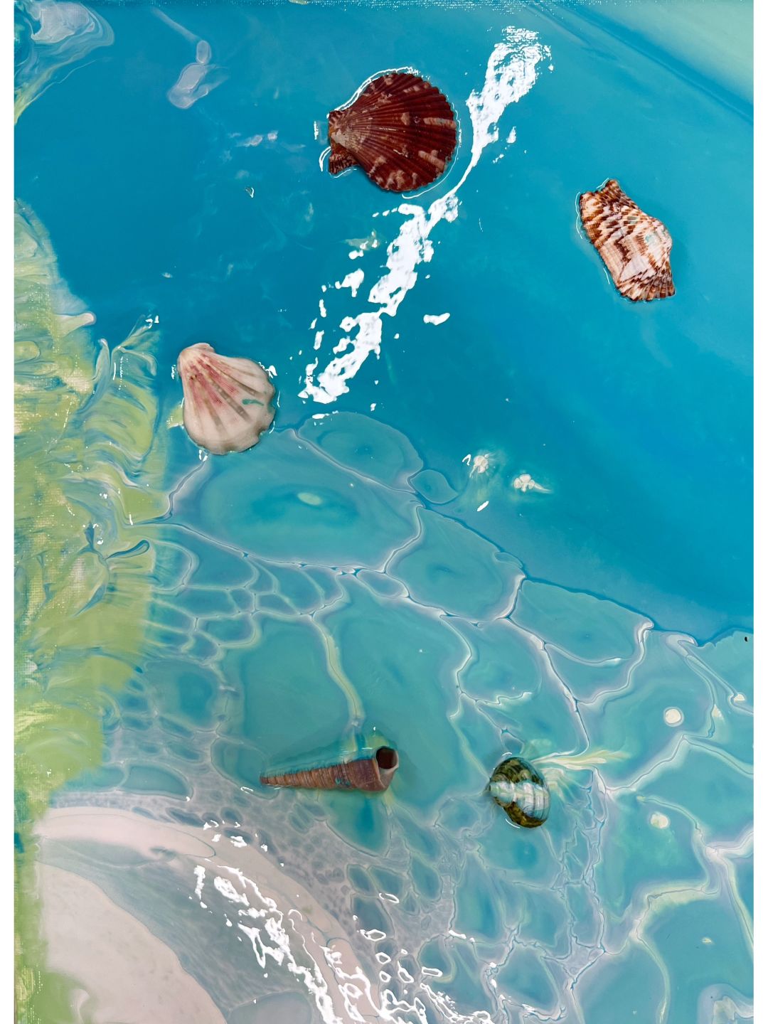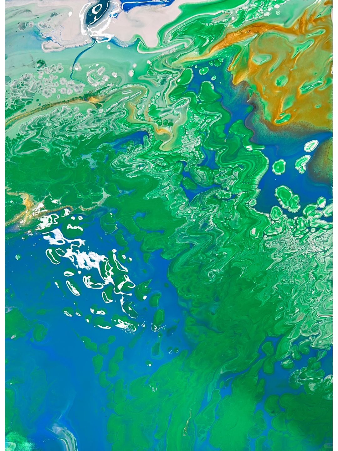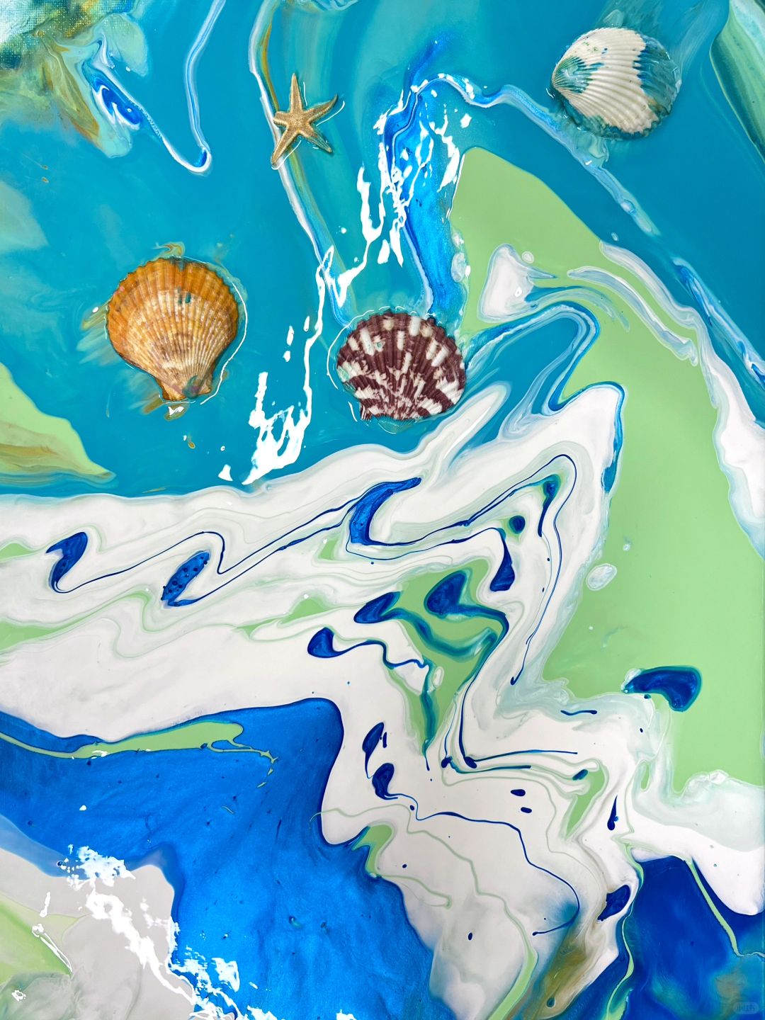 流体画《海洋》 今日课程《流体画海洋》 1.学习海洋的配色。 2.学习流体画制作方法“扣杯法”:将颜料依次倒入杯中,杯子倒扣在画布上,让颜料在画布上铺开。双手晃动画板,使颜料在画布上流淌,色彩会碰撞、融合出神奇的效果。