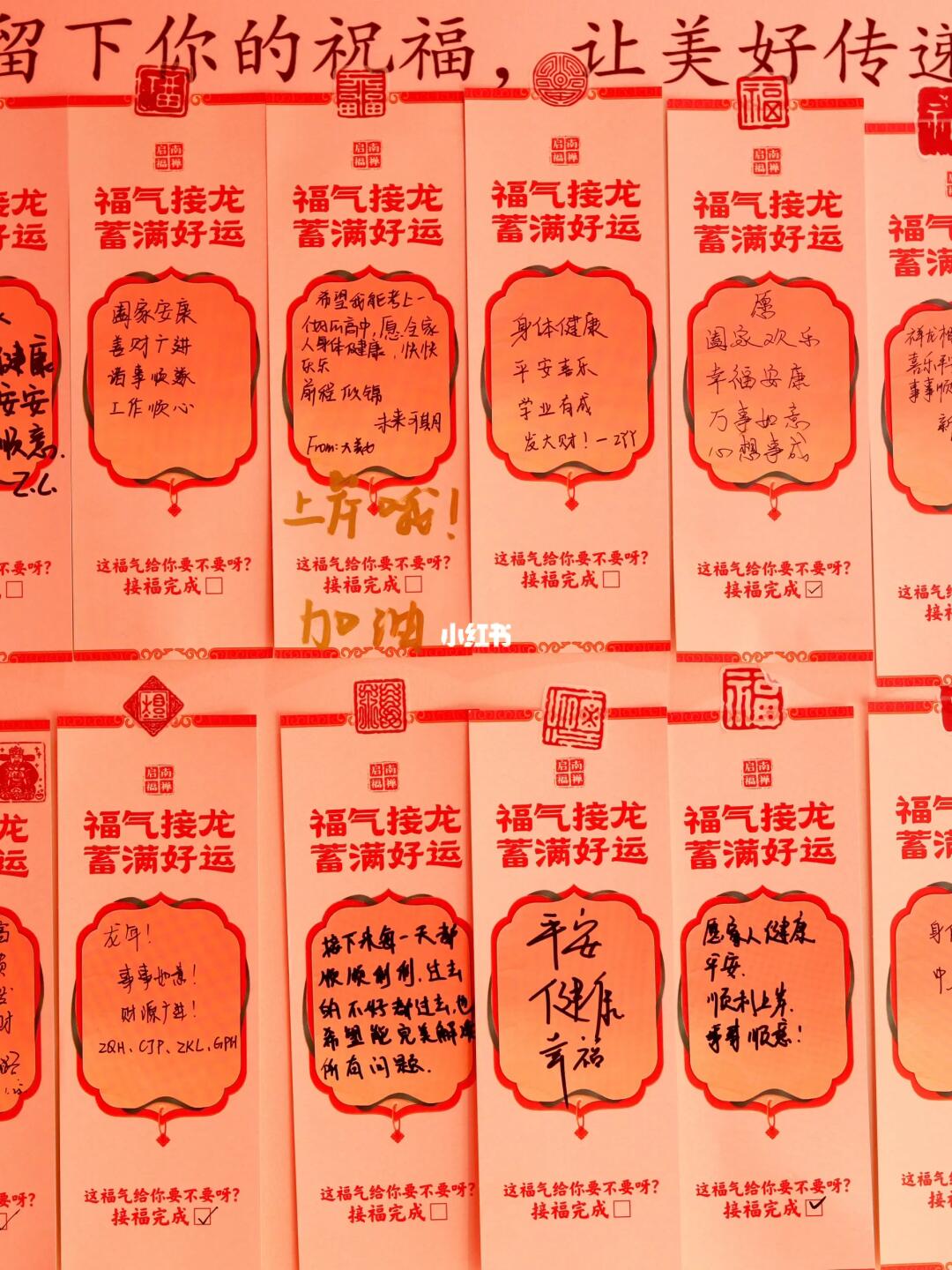 ❶在南禅寺文创店领取免费福气贴纸后,写下祝福语,贴上并取下合心意的完成福气接龙