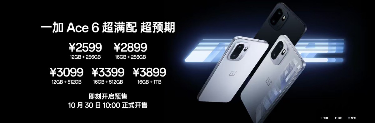一加Ace6起售价2599元,10月30日10:00全渠道开售,提供12GB+256GB至16GB+1TB四档配置,以亲民价格与全能配置成为年轻用户与游戏爱好者的首选。