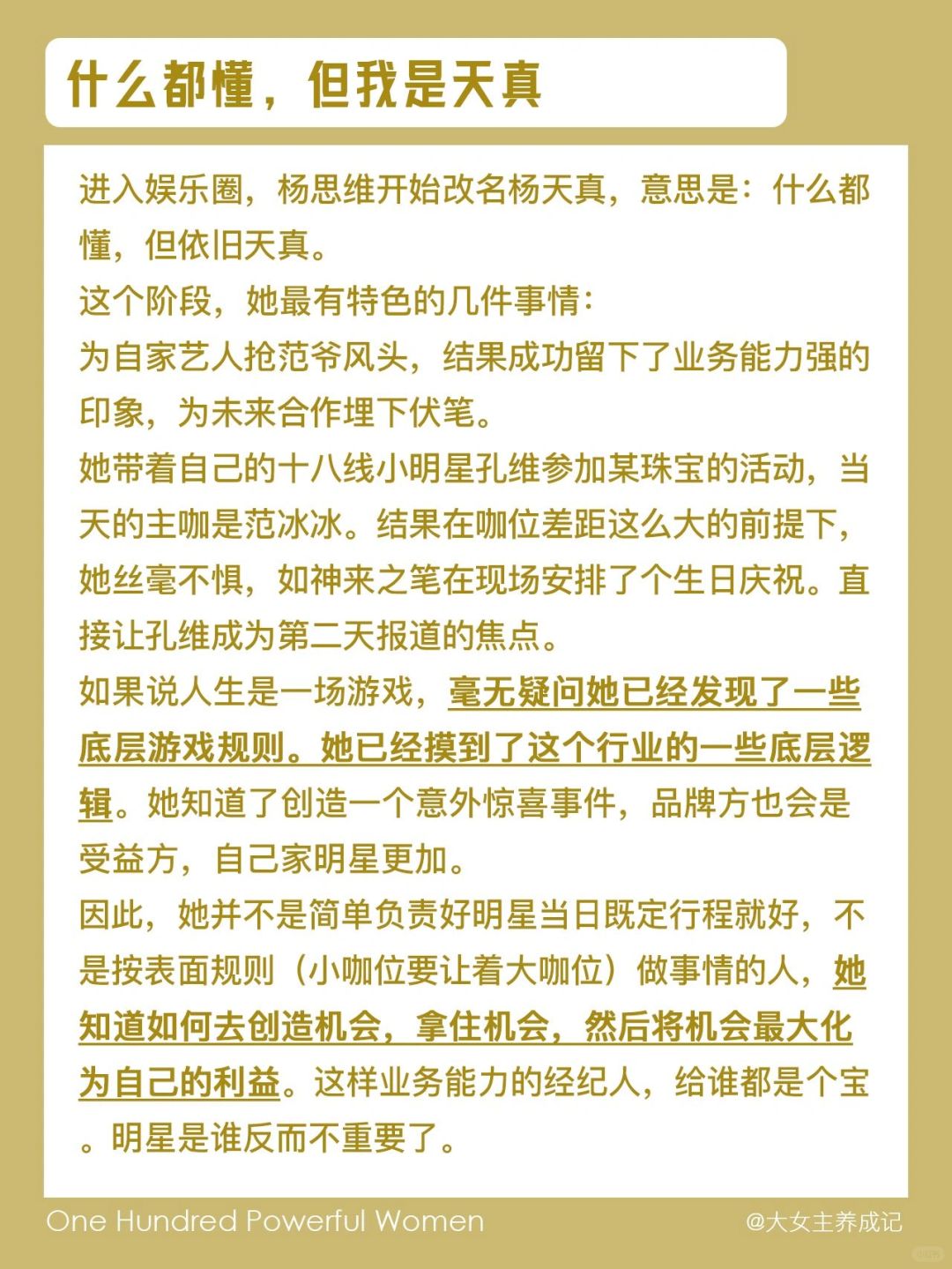 杨天真:我还能捧红100个范冰冰! 杨天真,一个比明星还红的经纪人,一个优缺点能自洽的冒险家,一个活成人间清醒、随时保持通透的高情商大女主。 20岁入行,23岁成名,29岁创办《壹心娱乐》并出任CEO,被称作“中国蕞好的经纪人”,35岁做直播,创立大码女装品牌plusmo。38岁她以丰富的职场人生创业经验出版了《通透》书籍。