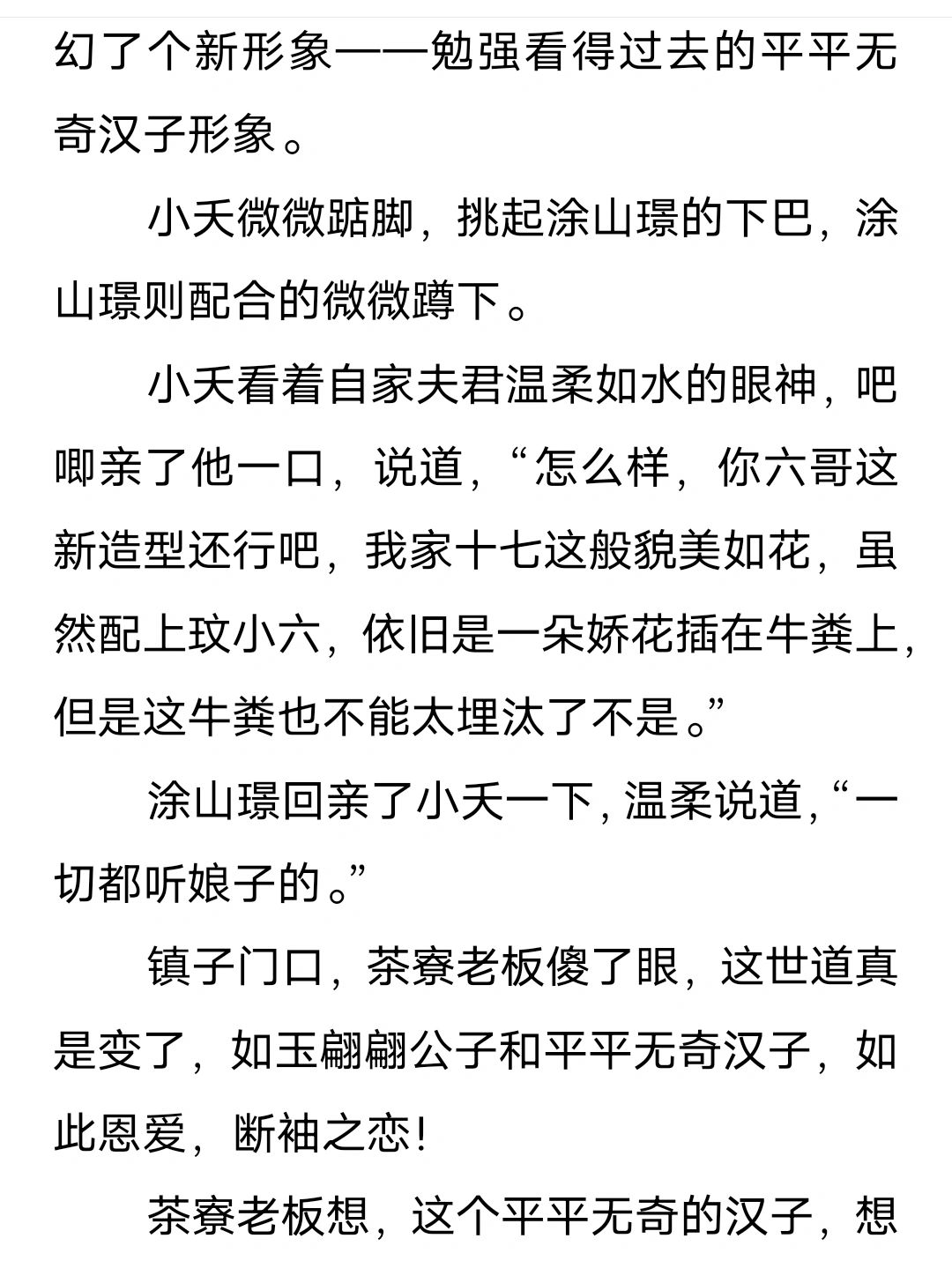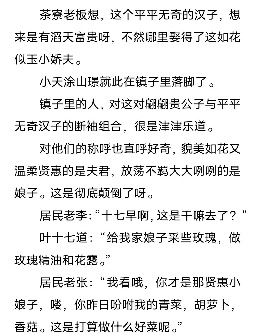 茶寮老板想,这个平平无奇的汉子,想来是有滔天富贵呀,不然哪里娶得了这如花似玉小娇夫。