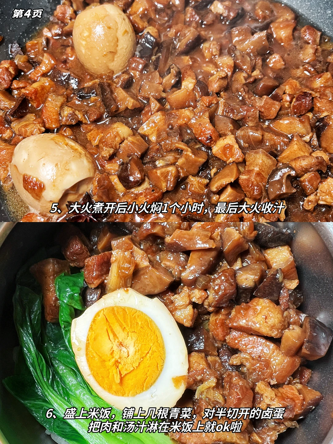 6、盛上米饭,铺上几根青菜,对半切开的卤蛋,把肉和汤汁淋在米饭上就ok啦
