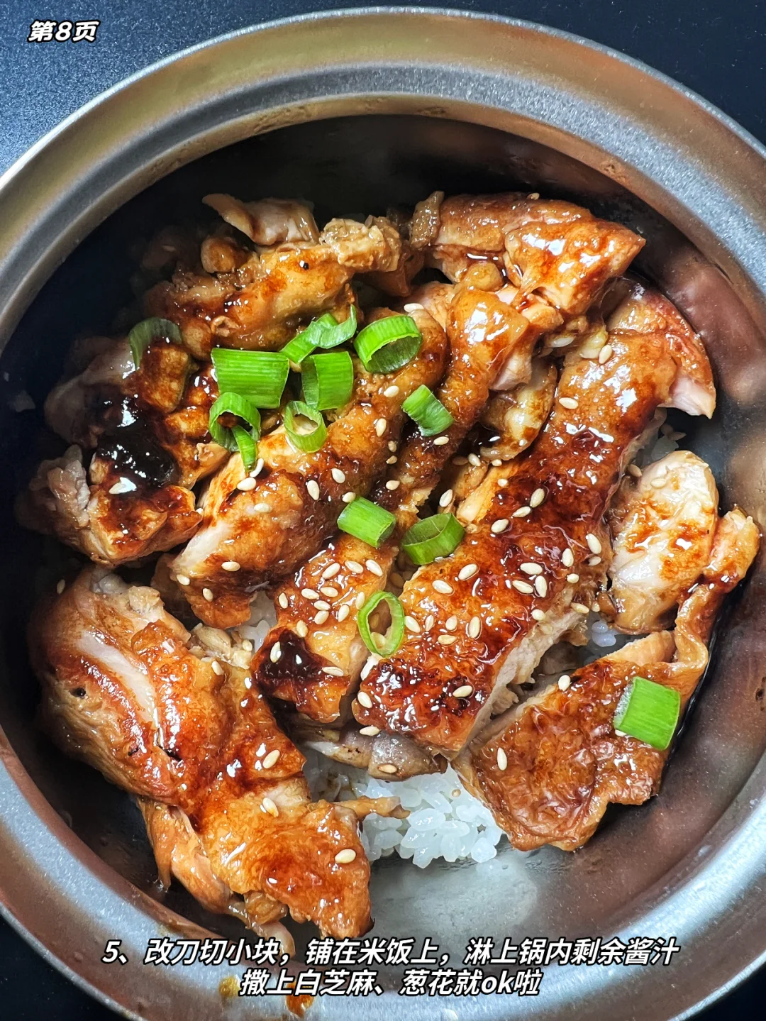 5. 切小块,铺在米饭上,淋上多余的酱汁,撒上白芝麻和葱花即可。