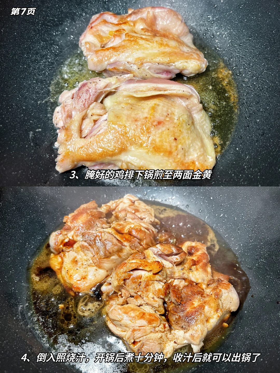 3. 将腌制好的鸡腿肉煎至两面金黄。
