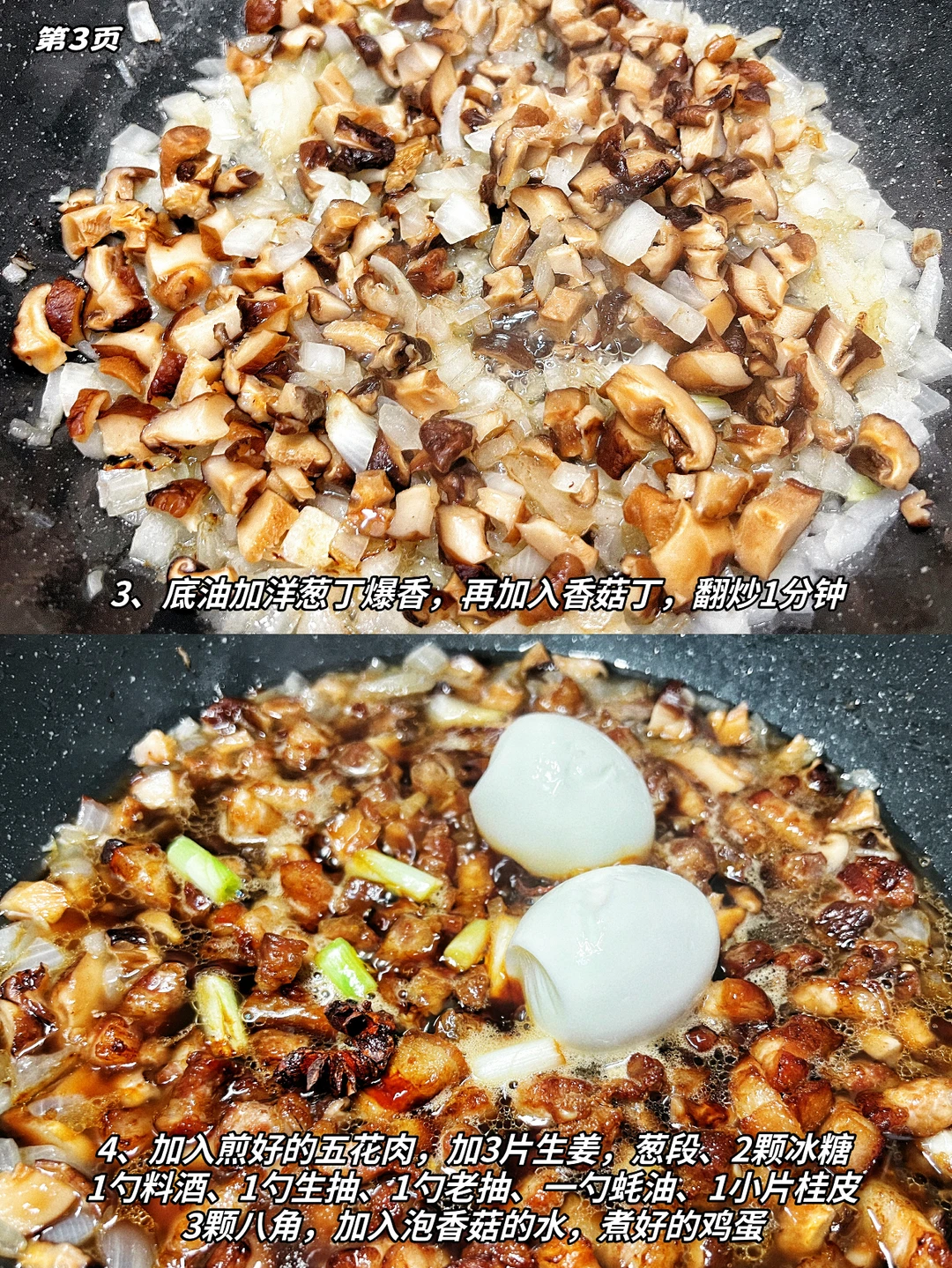 4、加入煎好的五花肉,加3片生姜,葱段、2颗冰糖、1勺料酒、1勺生抽、1勺老抽、一勺蚝油、1小片桂皮、3颗八角,加入泡香菇的水,煮好的鸡蛋