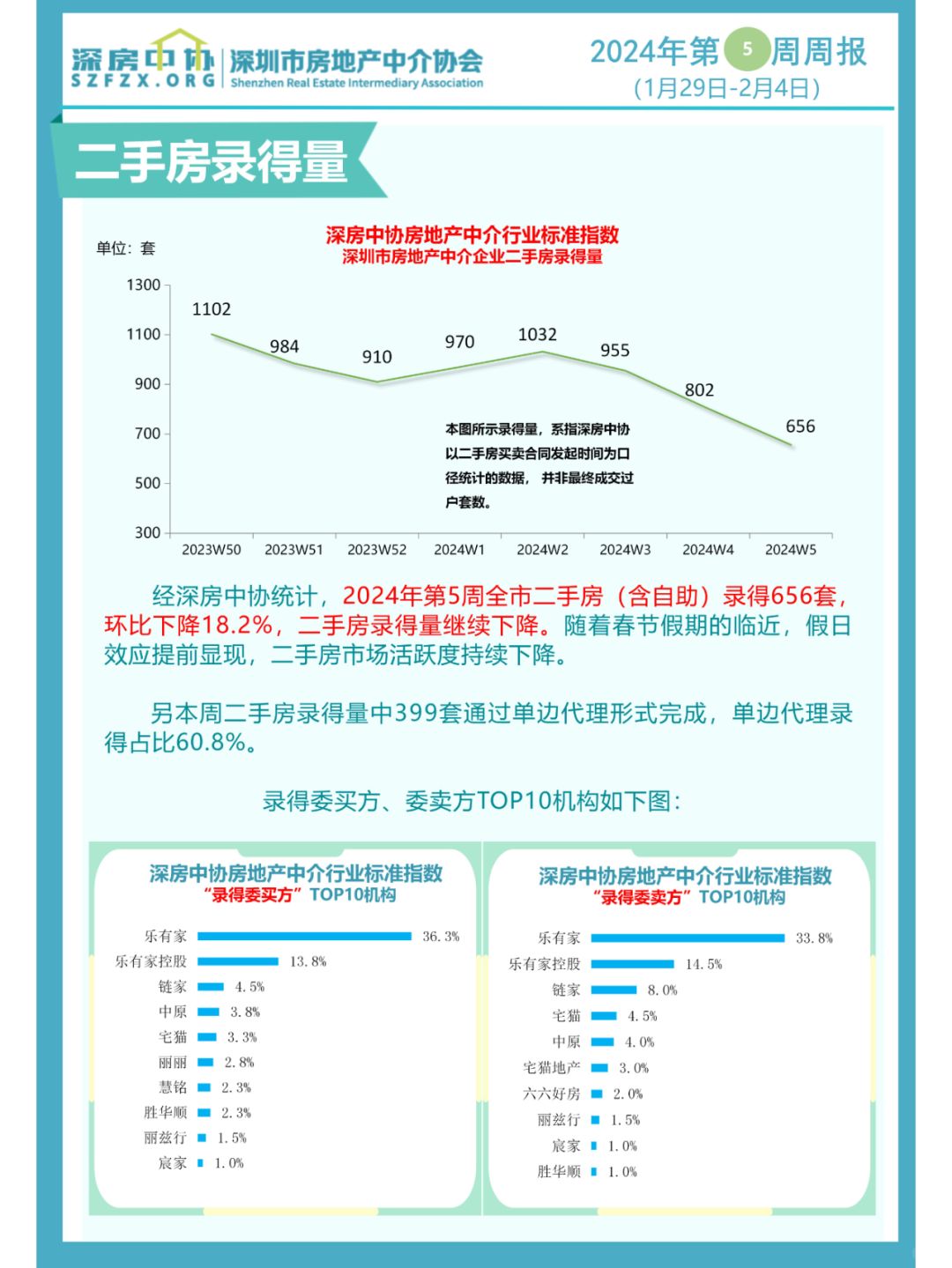 深房中协数据:2024年2月5日,深圳全市有效在售二手房源54123套,在售二手房源比上周减少3379套。上周(1月29日-2月4日)全市二手房录得656套,比上上周减少146套。 二手房在售房源和录得量都大幅回调,与临近春节有很大关系。假期效应显现,二手房市场交易活跃度明显下降。