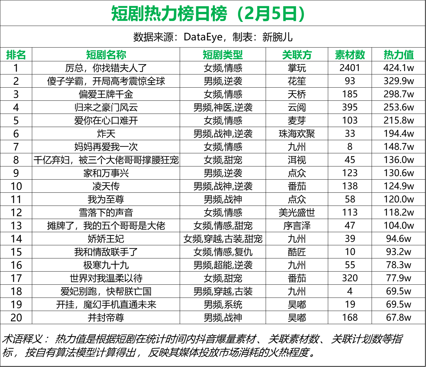 5日短剧消耗日榜:《厉总,你找错夫人了》第一,大盘5129万