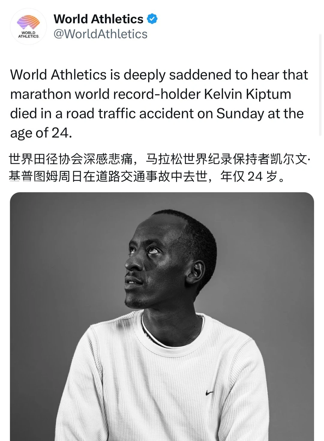 马拉松世界纪录保持者基普图姆不幸逝世🕯️