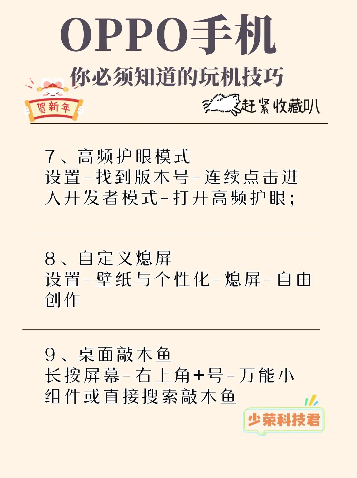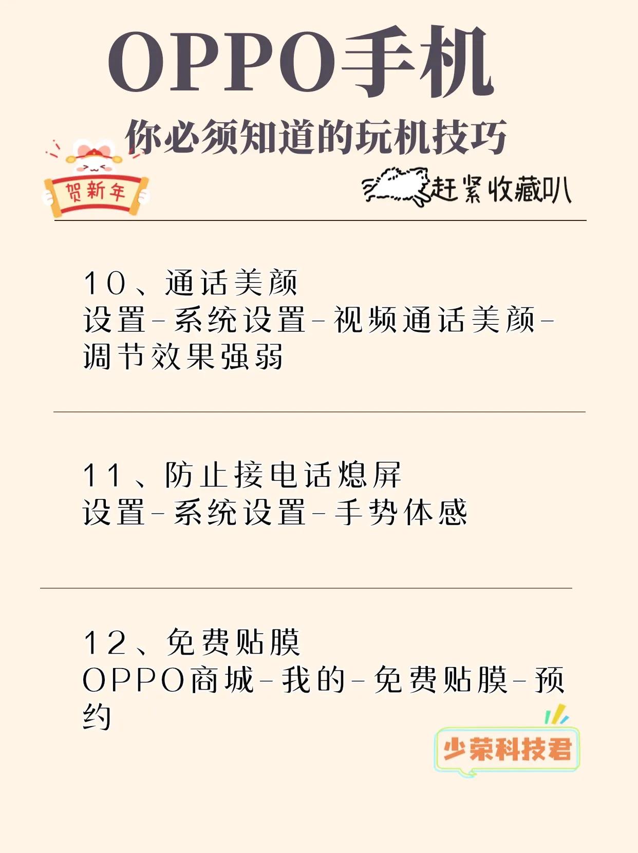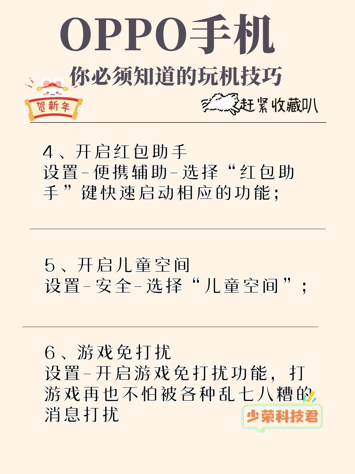 OPPO手机玩机技巧第(二)弹 1、智能隐藏消息 2、关闭单独APP通知内容 3、关闭锁屏所有通知内容 4、开启红包助手 5、开启儿童空间 6、游戏免打扰 7、高频护眼模式 8、自定义熄屏 9、桌面敲木鱼 10、通话美颜 11、防止接电话熄屏 12、免费贴膜#好用的手机应用#