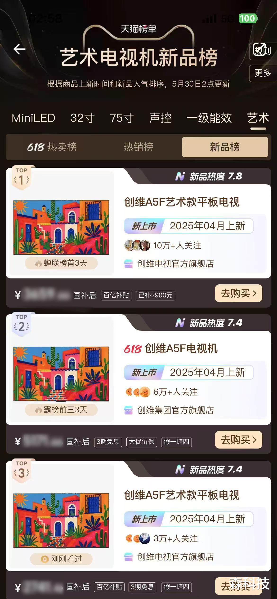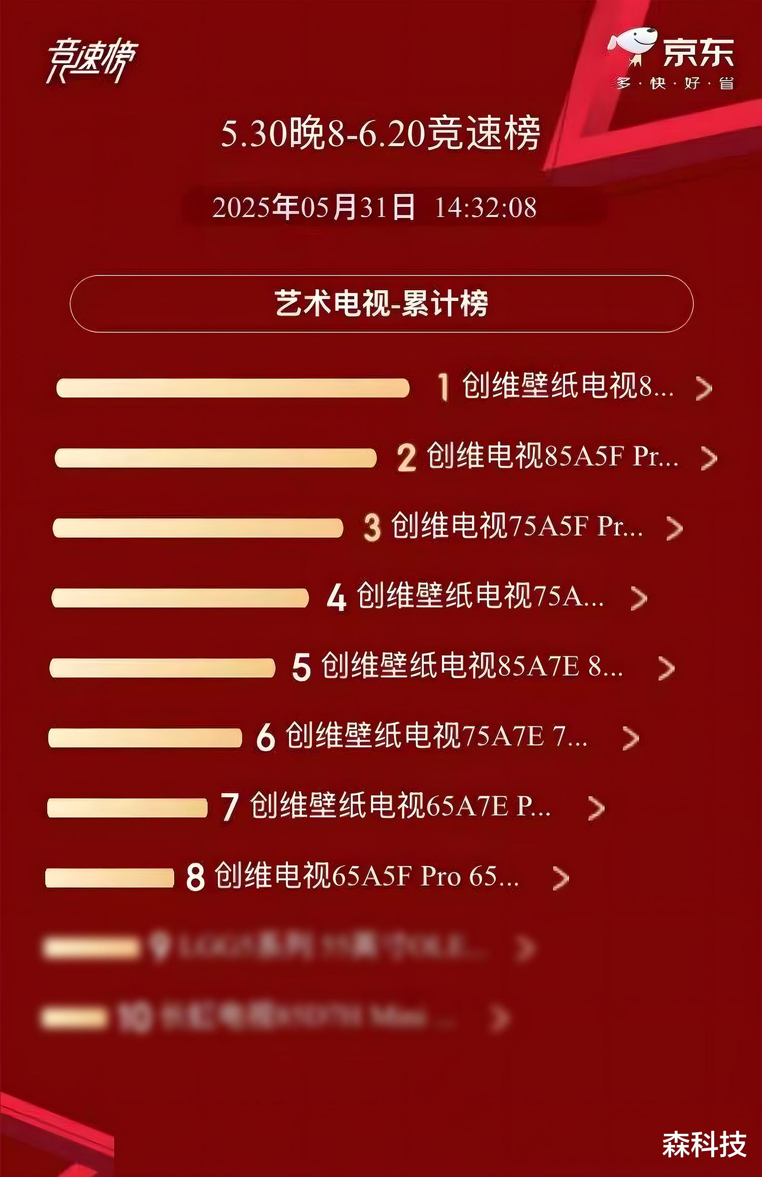 在京东艺术电视品类累计榜TOP10中,创维壁纸电视强势占据前八席;天猫艺术电视机新品榜,创维更是垄断前三。