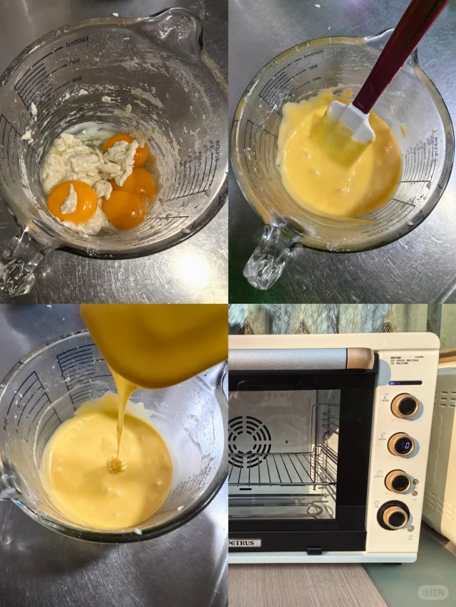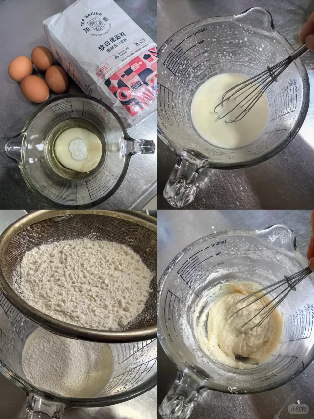 2. 将低筋面粉筛入油奶混合液中,混合成乳白色糊状。