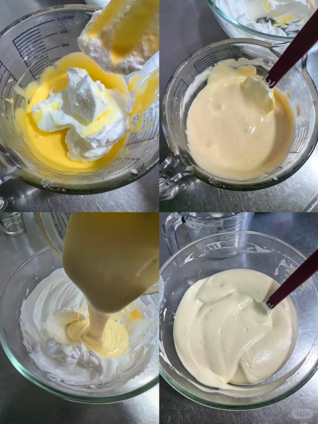6. 将三分之一的蛋白霜加入到蛋黄糊里搅拌均匀,再将搅拌好的蛋糕糊倒回到剩余的蛋白霜中,继续搅拌均匀。