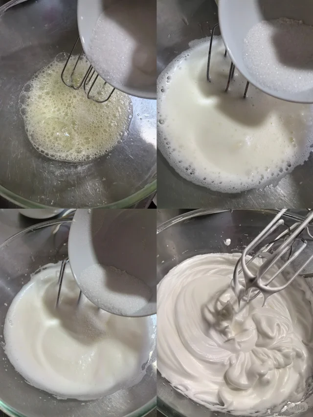 5. 细砂糖分三次加入蛋白内,打至直到蛋白霜变得细腻、坚挺、有光泽,能拉出完整的尖角即可停止。