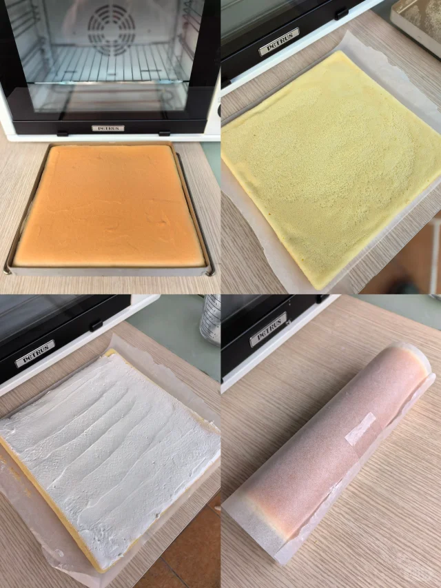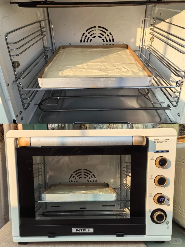 8. 将烤盘放入预热的烤箱中层,150度,30分钟。用的K55是50L的烤箱,容量大的优点就是烤色均匀,选择正面卷就很好看,如果是小烤箱,烤色不如意的话,可以选择反面毛巾卷。