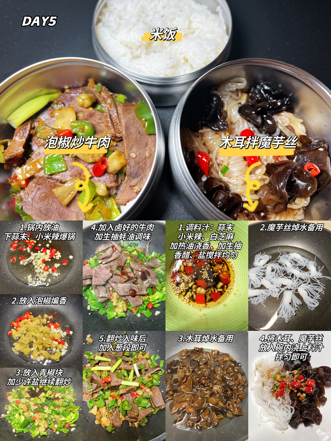 周五:酸辣开胃🌶(泡椒炒牛肉🐂、木耳拌魔芋丝🎉)