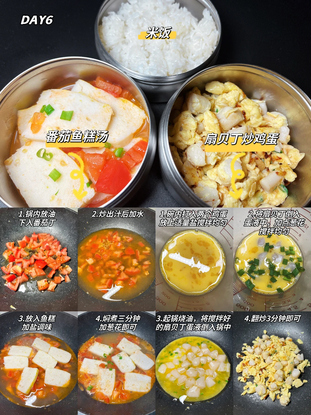 周六:海鲜盛宴🦞(扇贝丁炒鸡蛋🥚、番茄鱼糕汤🐟)