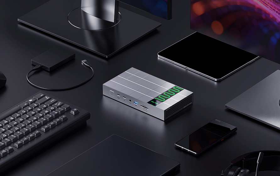 我们的设计哲学很简单:用最简洁的连接,兑现最强大的扩展。对于只有寥寥数个雷电口的设备,每一次拔插都是效率的中断。现在,您只需通过一根雷电数据线,即可瞬间获得一个功能齐全的专业工作站。连接后,您的设备将自动拥有: