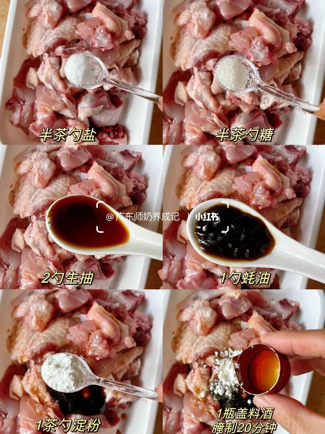 1️⃣鸡肉剁成拇指大小,参考图片腌制