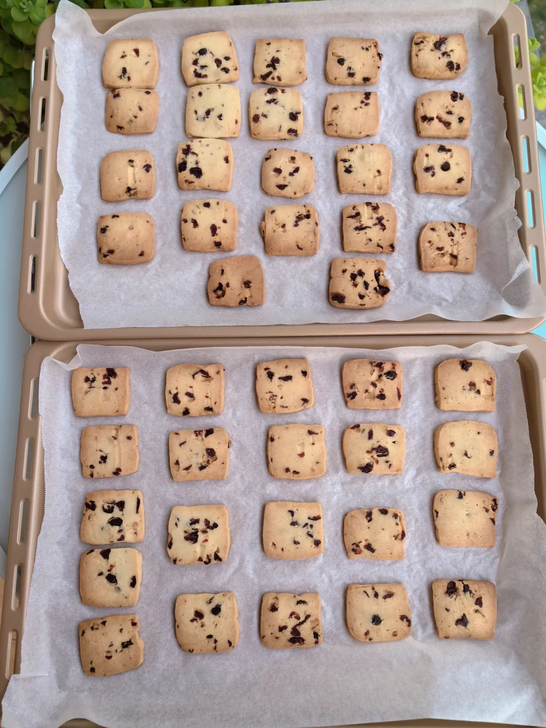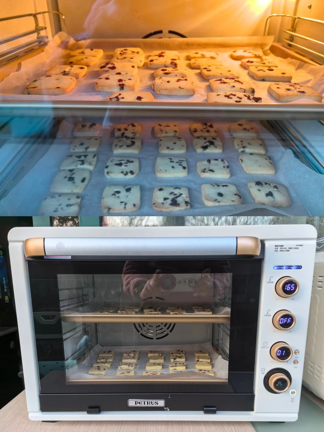 9. 放入预热好的烤箱,烤盘分别放在中层和下层,开启风炉模式,160度,15分钟。K55pro的风炉热风正反循环,可以确保两层的饼干烤色均匀,如果烤箱没有风炉模式,建议中间取出烤盘对换前后位置,得到烤色均匀的饼干。