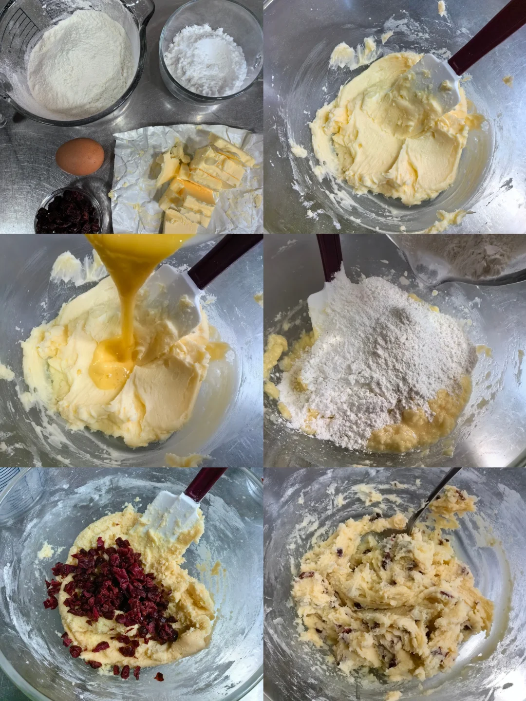 低筋面粉: 230克 | 鸡蛋液:30克 | 黄油:140克 | 糖粉:90克 | 蔓越莓干:50克