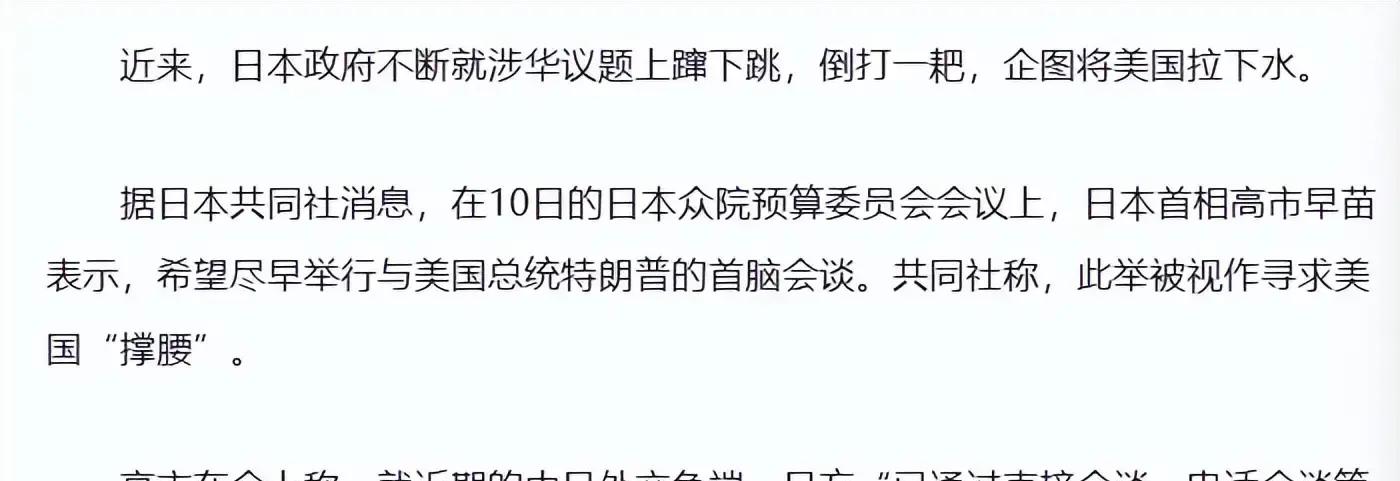 事态全面失控之际,高市早苗第一时间想到了美国。她是否还能像以往那样,让美国替自己撑腰?这一次,她把希望寄托在特朗普身上。日本共同社报道称,在众议院预算委员会上,高市直接呼吁:必须与特朗普沟通,美国得出面帮我们说话。